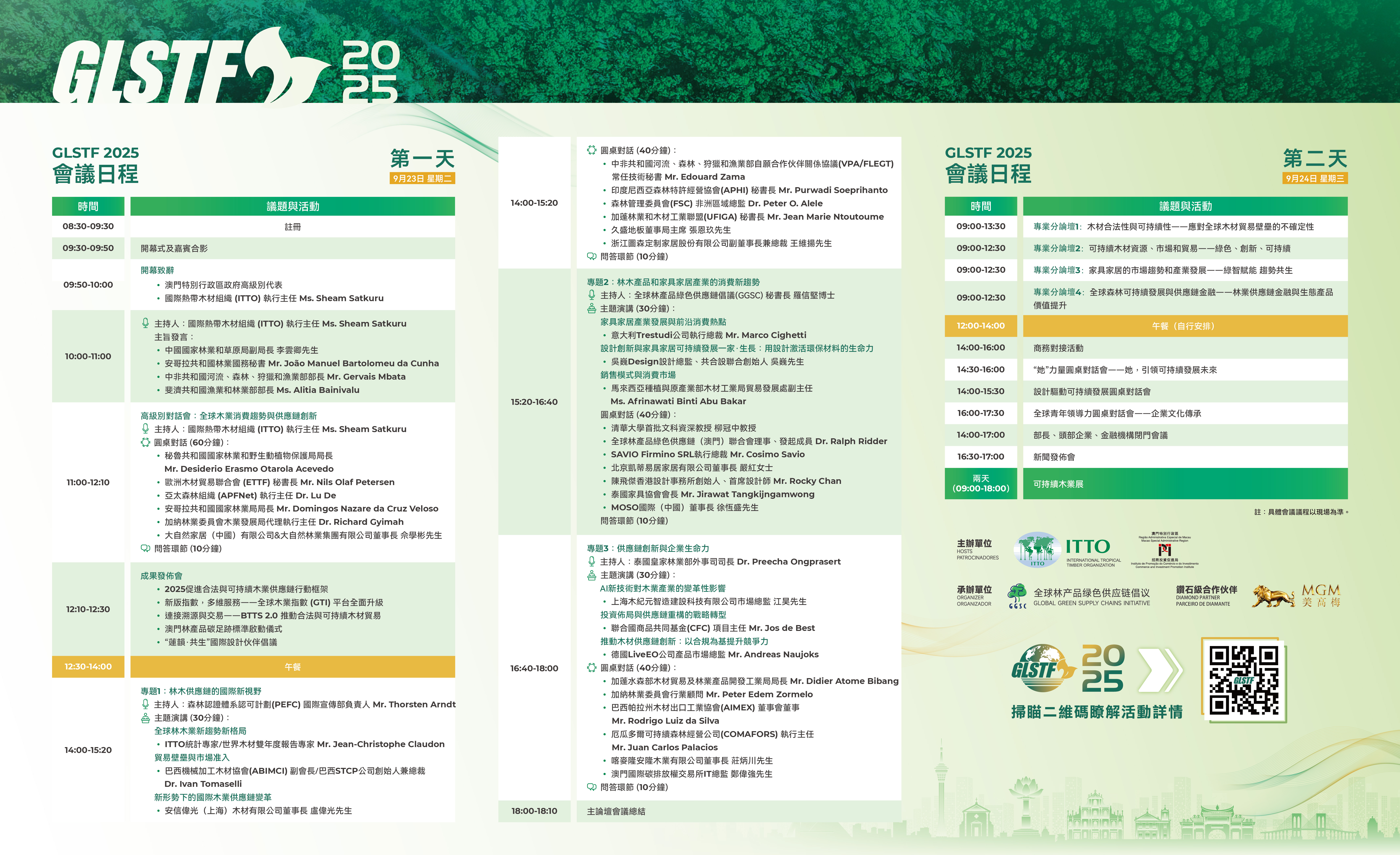 “2025全球合法與可持續木業高峰論壇(GLSTF 2025)”將於9月23至24日在澳門美獅美高梅舉行,以“從森林到家庭—消費趨勢與供應鏈創新的國際對話”為主題,規劃了會議、圓桌對話會、展覽、B2B商務對接和首發等近20項多元活動,預計吸引全球超過40個國家的林木家居產業關鍵參與方匯聚澳門開展高質量交流與合作。GLSTF2025由澳門特別行政區招商投資促進局(IPIM)和國際熱帶木材組織(ITTO)共同主辦,並由全球林產品綠色供應鏈倡議(GGSC)秘書處作為承辦單位,美高梅作為“鑽石級合作伙伴”提供支持。