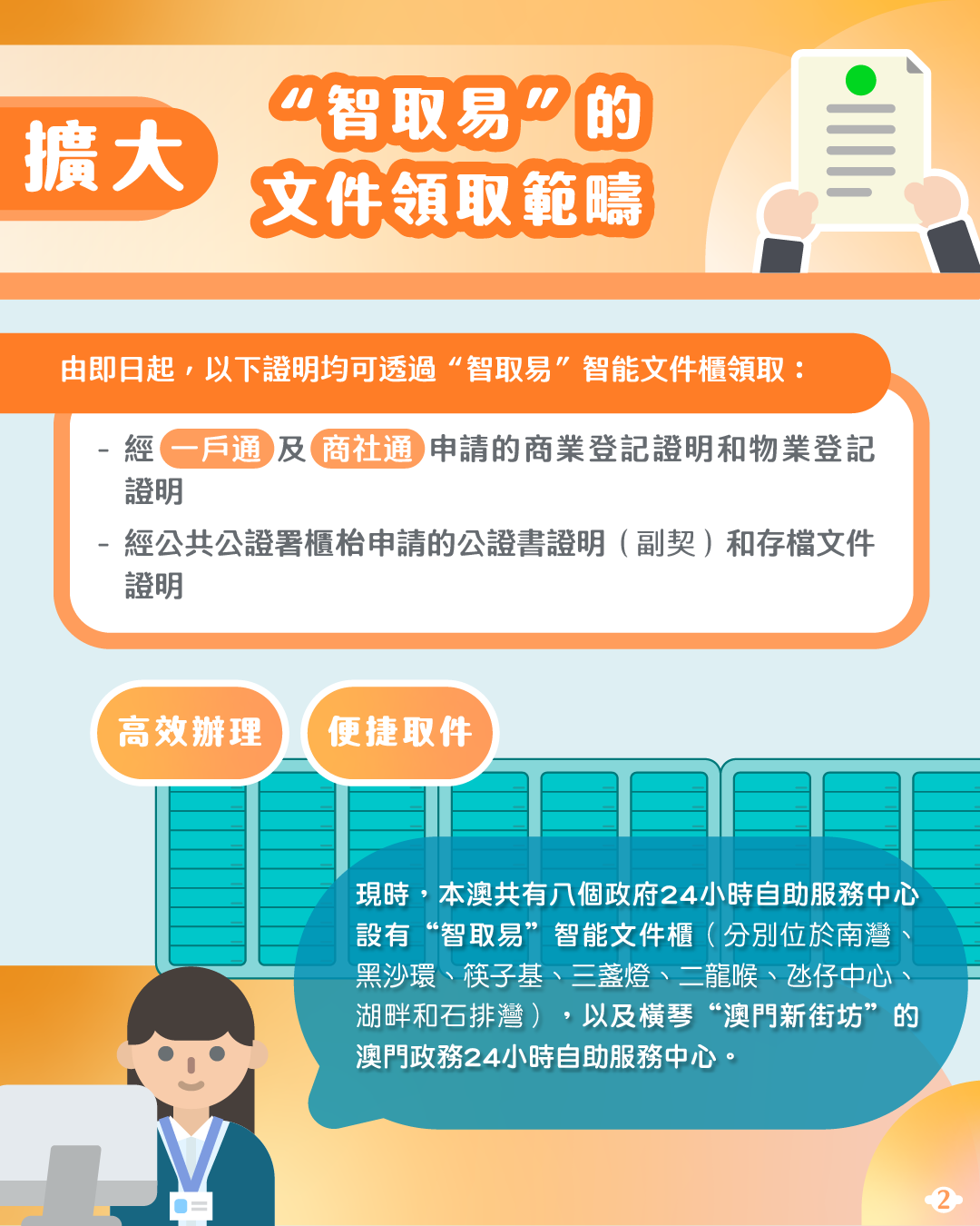 同時,“智取易”智能文件櫃的服務範圍也進一步擴大。由即日起,經公共公證署櫃枱申請的公證書證明(副契)和存檔文件證明,以及經“一戶通”及“商社通”申請的商業登記證明和物業登記證明均可透過智能文件櫃領取。這意味着經線上申請的登記證明均可透過智能文件櫃領取,市民無須再受限於固定的辦公時間申請及領件,實現“高效辦理、便捷取件”的目標。