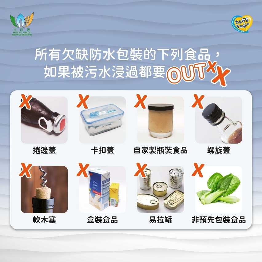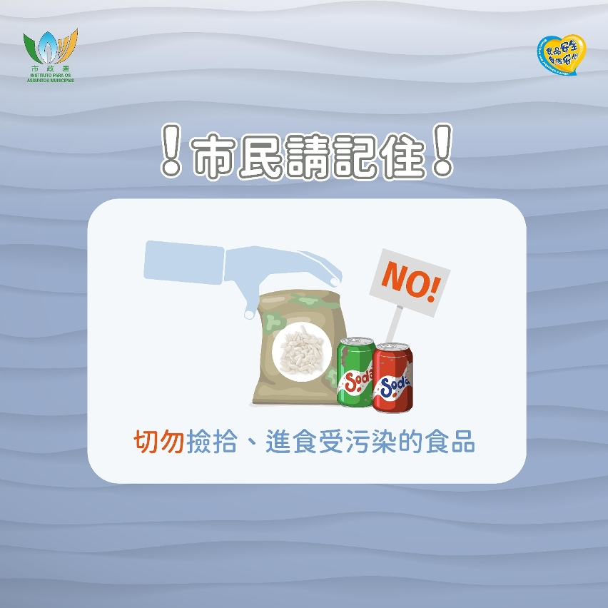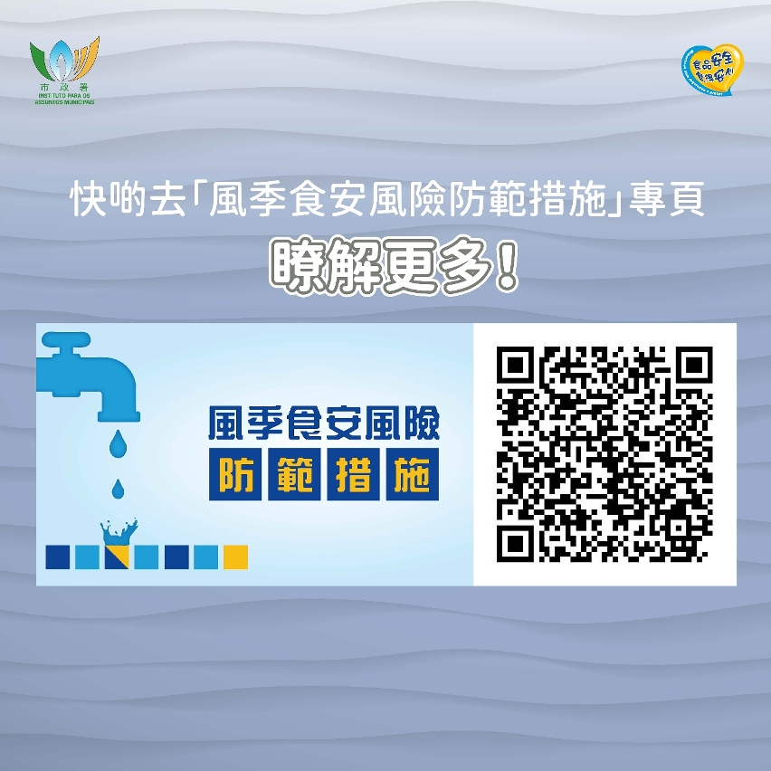另外,食物及經營場所如受水浸或停電影響,切勿供應及出售廢棄、腐敗或變質的食品;並應採取適當的清潔消毒及善後措施。食品業界更要全力配合食安工作,妥善包好受水浸或停電影響而變質的食品,並直接自行運往焚化爐銷毀,切勿隨意堆放或棄置於街上,慎防他人撿拾,影響食品安全及公共衛生。市政署亦製作了“風季食安風險防範措施”專題網頁,歡迎市民及食品業界於食安資訊網(https://www.iam.gov.mo/foodsafety)查閱。