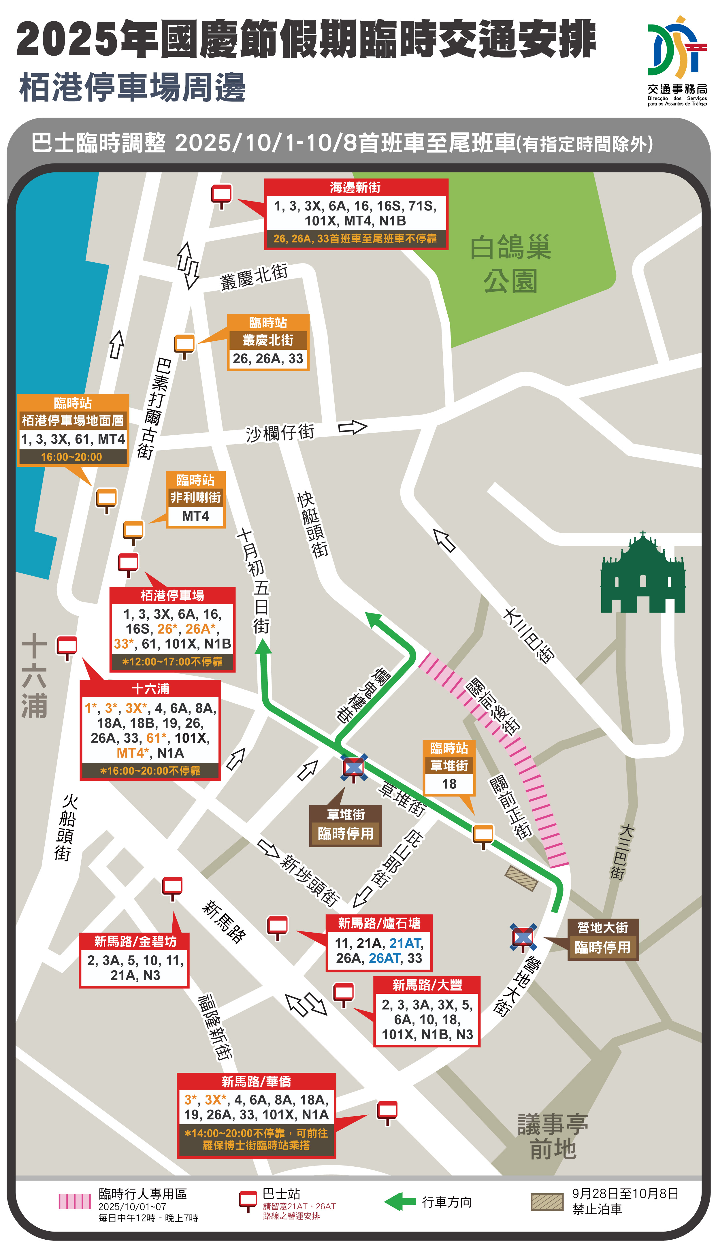 巴士服務方面,參考過往重大節假日的運作經驗並配合時限性節慶活動,交通事務局除繼續維持過往於關閘廣場東側、新馬路、南灣、營地大街周邊、栢港停車場一帶、氹仔舊城區等的臨時分流措施外,是次亦會利用栢港停車場地面層闢作臨時巴士分流站,於10月1日至8日每日下午4時至晚上8時,分流“十六浦"站的1、3、3X、61及MT4路線,以優化候車空間及交通通行緩衝能力;而為進一步理順“亞馬喇前地"站的候車情況及加強周邊道路的疏散能力,於上述同一時段,即10月1日至8日每日下午4時至晚上8時期間,停靠“亞馬喇前地"站(G車道)的39、50、50B、MT1、MT2及MT5路線將改為停靠“葡京酒店"站。另一方面,兩巴因應客流情況增加班次,會於10月1日至8日期間臨時營運時節性及特班車路線3BX、17T、21AT、26AT及101X特班車(101XS),以增強運力、加快乘客疏運。周邊相關道路將同步實施臨時交通管制,具體巴士調整詳情可參閱附表或瀏覽兩巴網站(澳巴:www.tcm.com.mo,新福利:www.transmac.com.mo)。