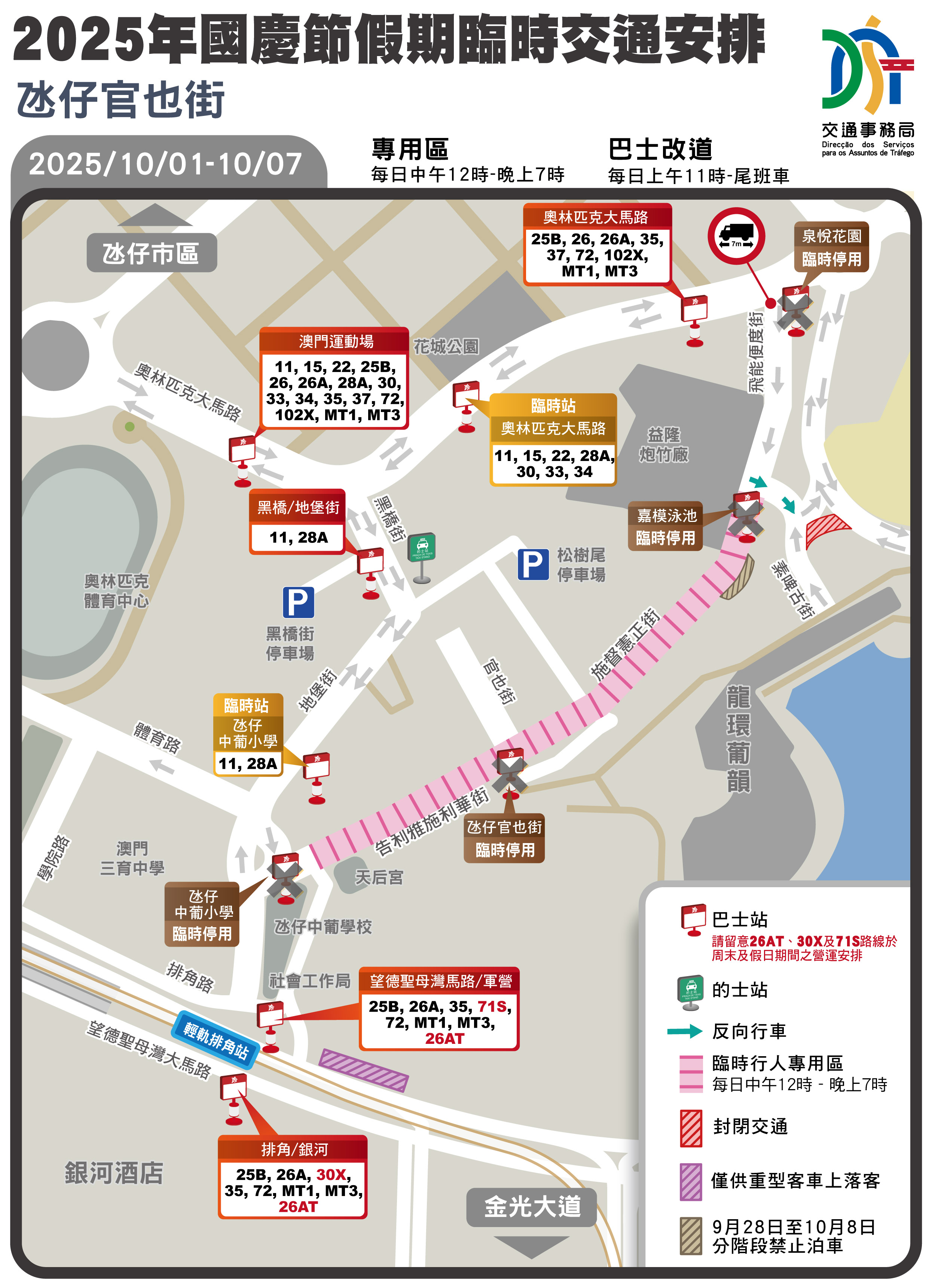 備註:澳門關前後街及氹仔舊城區設置臨時行人專用區的交通安排詳情:https://www.dsat.gov.mo/dsat/news_detail.aspx?a_id=2C2E03DFA02CB3B00896A613EF0A992C