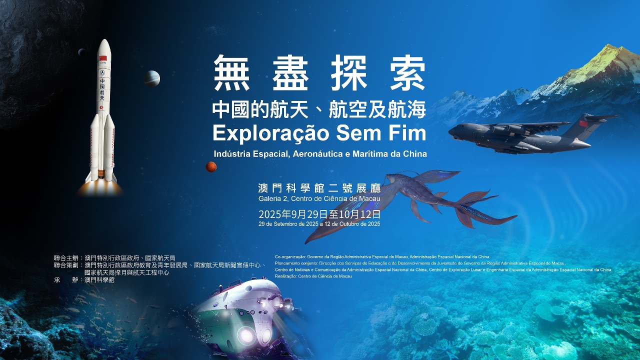 由澳門特別行政區政府與國家航天局主辦,教育及青年發展局、國家航天局新聞宣傳中心、國家航天局探月與航天工程中心聯合策劃,澳門科學館承辦的“無盡探索——中國的航天、航空及航海”展覽,於9月29日至10月12日在澳門科學館舉行。是次科普展覽首次在澳門展出月球背面土壤,結合中國航空和航海方面的重要展品,讓公眾一同感受國家科技事業發展的偉大成就,激發青年學生探索科技的熱情。
