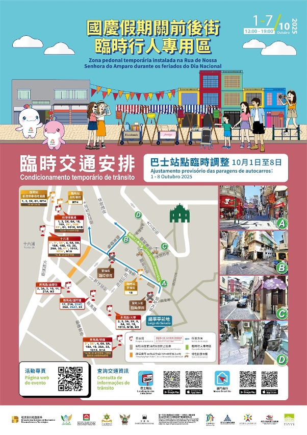 為迎接十一國慶假期,確保氹仔舊城區及大三巴鄰近地區的人流及交通有序通行,經濟及科技發展局(下稱“經科局”)、市政署、旅遊局、治安警察局、消防局、文化局、第十五屆全國運動會及全國第十二屆殘疾人運動會暨第九屆特殊奧林匹克運動會澳門賽區籌備辦公室(下稱“十五運辦公室”)及交通事務局聯同澳門街坊會聯合總會、澳門離島工商業聯合會及澳門中區南區工商聯會合作設置“國慶假期臨時行人專用區”。