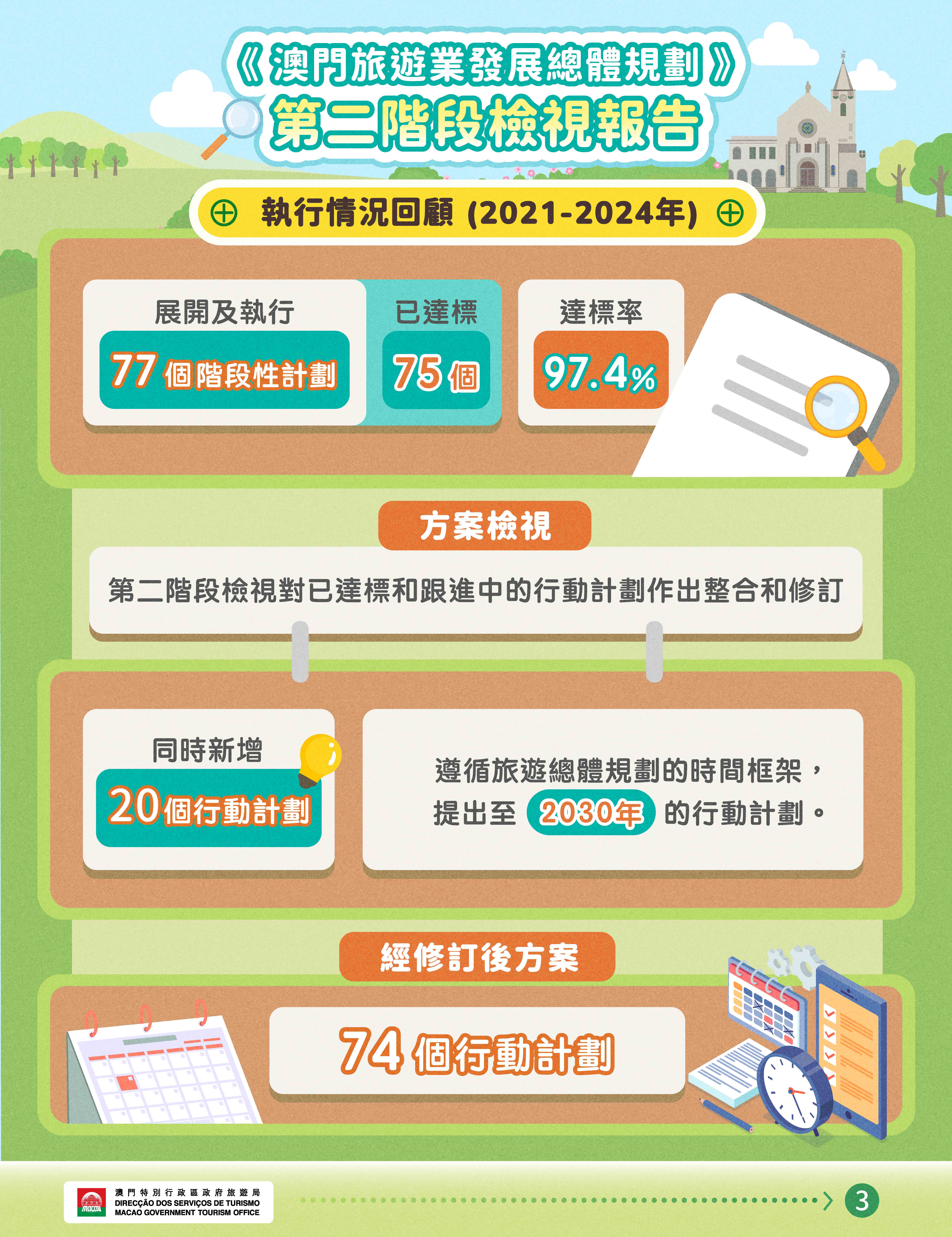 另外,第二階段檢視報告亦包含2030年關鍵指標預測及趨勢,供公眾參考。有興趣的公眾可於以下專題網頁下載《澳門旅遊業發展總體規劃》第二階段檢視報告(中文、葡文及英文版本): masterplan.macaotourism.gov.mo。