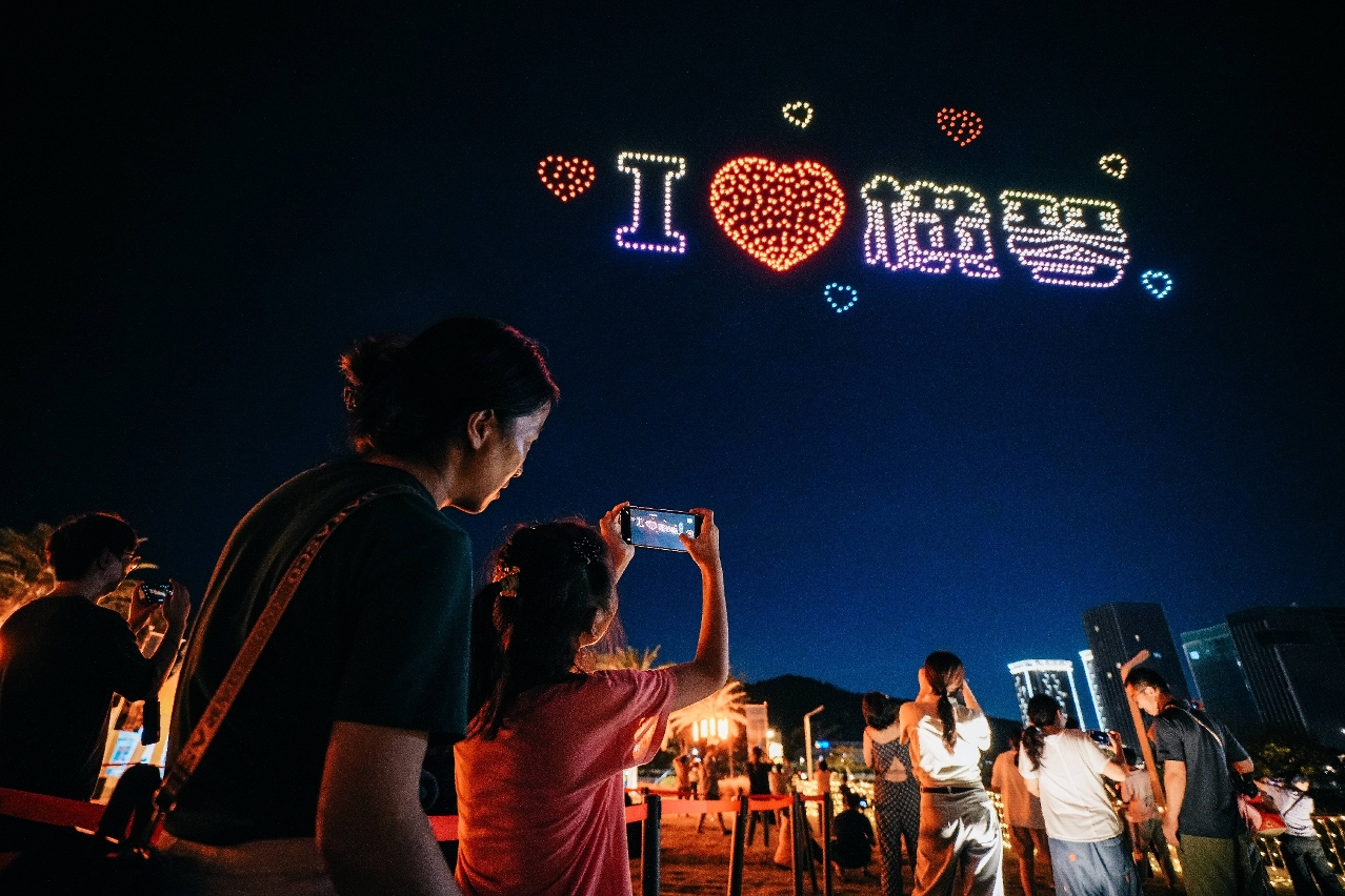 晚8時許,超700架無人機準時升空,在天上化作巨幅畫布,編織出一幅流動畫卷,相繼排列出中秋、十五運吉祥物等造型,以及對國家繁榮昌盛的祝福,將現場氣氛推向高潮。