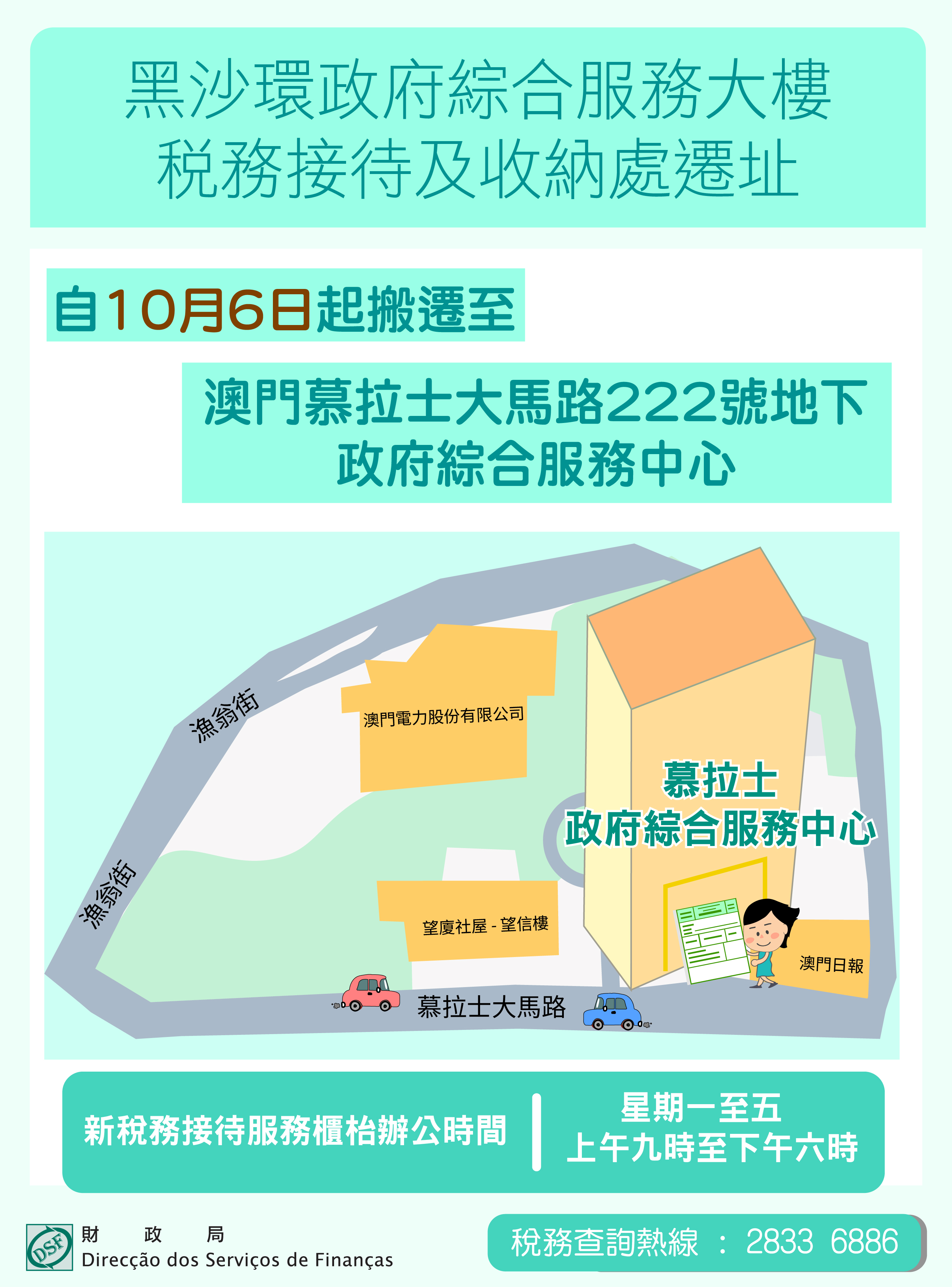 財政局位於澳門黑沙環新街52號政府綜合服務大樓-稅務接待及收納處之最後辦公日至2025年10月3日,並於2025年10月6日起遷往澳門慕拉士大馬路 222 號地下之政府綜合服務中心繼續對外服務。