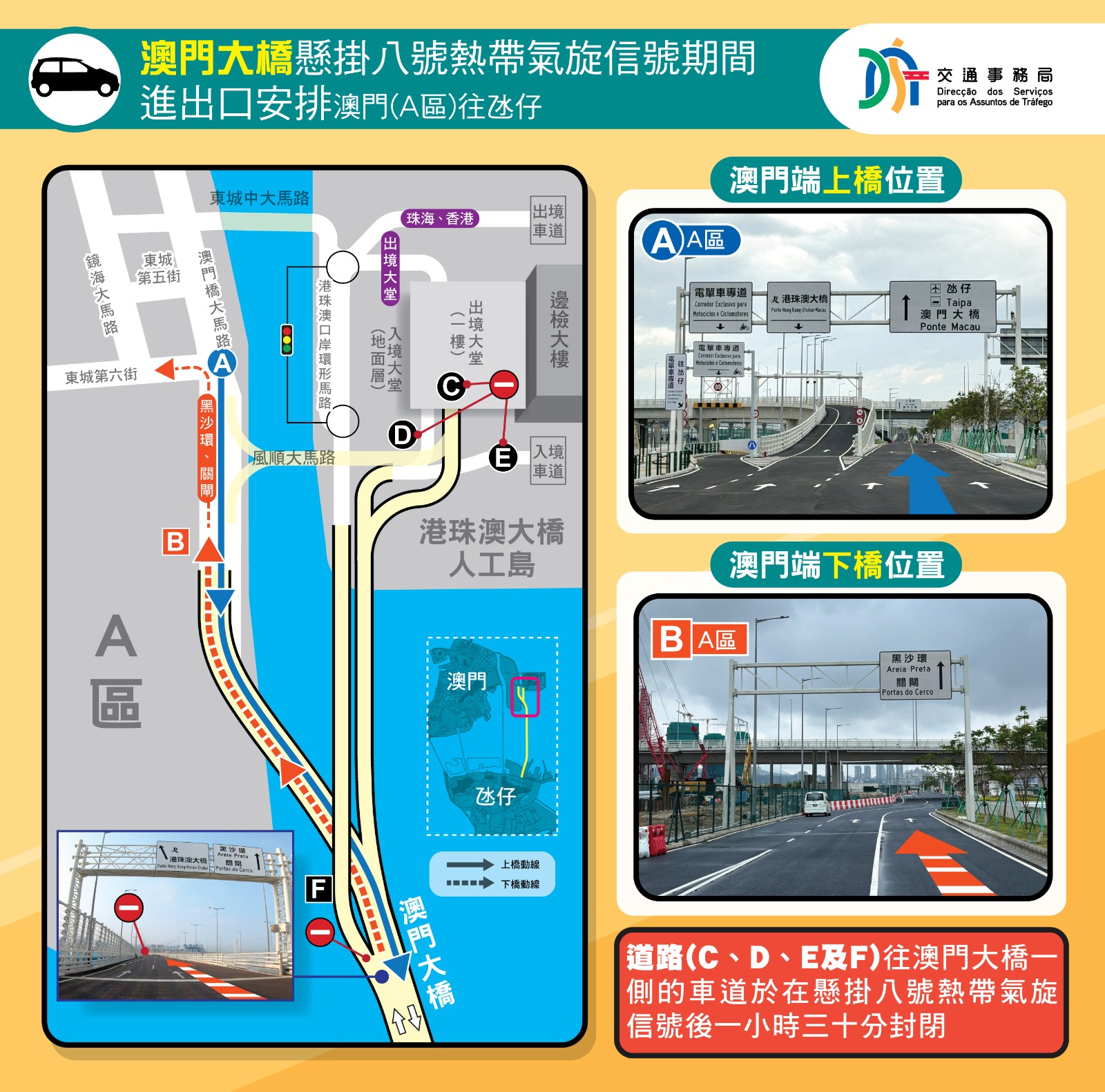 為保障惡劣天氣下市民必要的跨海出行需要,經跨部門協調,特區政府將在8號風球期間,開放澳門大橋供有限度通行(詳情請查閱附表),但如熱帶氣旋的強度、風暴潮水位、降水量及風力等因素構成足以妨害公共安全的風險,民防聯合行動指揮官可隨時禁止輕型客車在澳門大橋通行,敬請市民留意及注意安全。