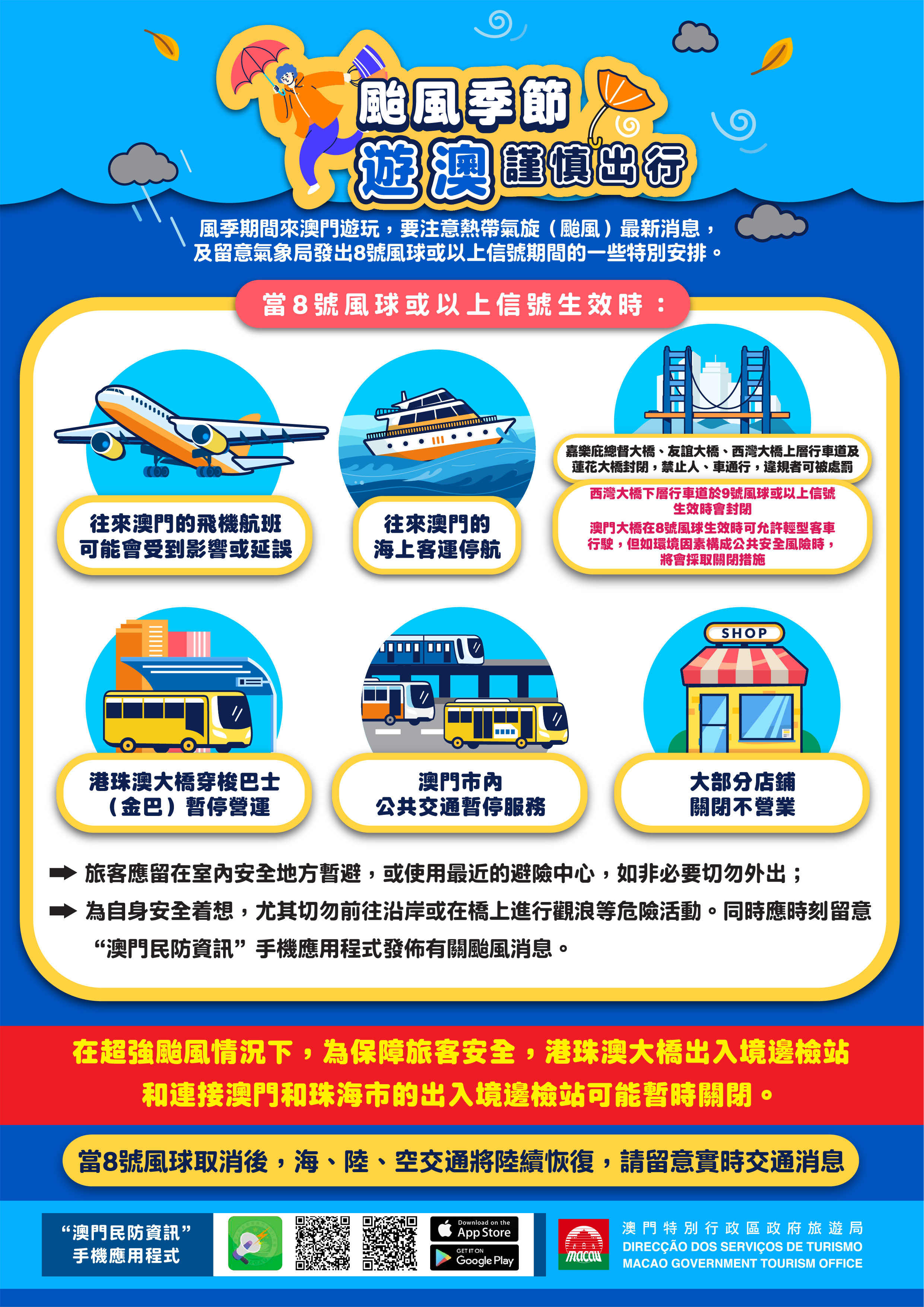根據澳門地球物理氣象局資料,八號風球即將懸掛。旅遊局將向身處外地的澳門居民和在澳旅客發出有關懸掛八號風球的手機提示訊息。八號或以上風球期間,澳門所有公共交通服務暫停,旅遊局呼籲旅客逗留在安全地方,避免外出,並建議旅客密切留意澳門地球物理氣象局網站www.smg.gov.mo/zh、新聞局網站www.gcs.gov.mo或下載“澳門民防資訊”手機應用程式,以獲取最新資訊及民防訊息。旅遊局網頁及社交平台亦有轉載氣象相關訊息,旅遊熱線(2833 3000)維持24小時運作。