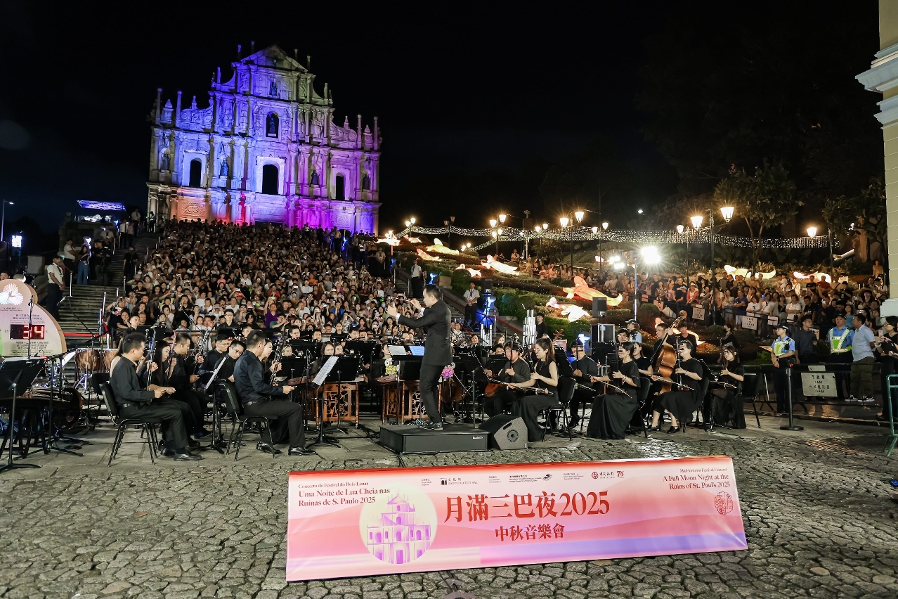 由文化局主辦、澳門樂團有限公司承辦的“月滿三巴夜2025”中秋音樂會,於10月6日8時及9時在大三巴牌坊舉行。澳門中樂團於世界遺產景點奏響一系列洋溢中秋韻味的經典樂章,吸引眾多市民旅客駐足聆賞,在璀璨夜色中感受文化傳承的瑰麗奇景及圓月溫情。