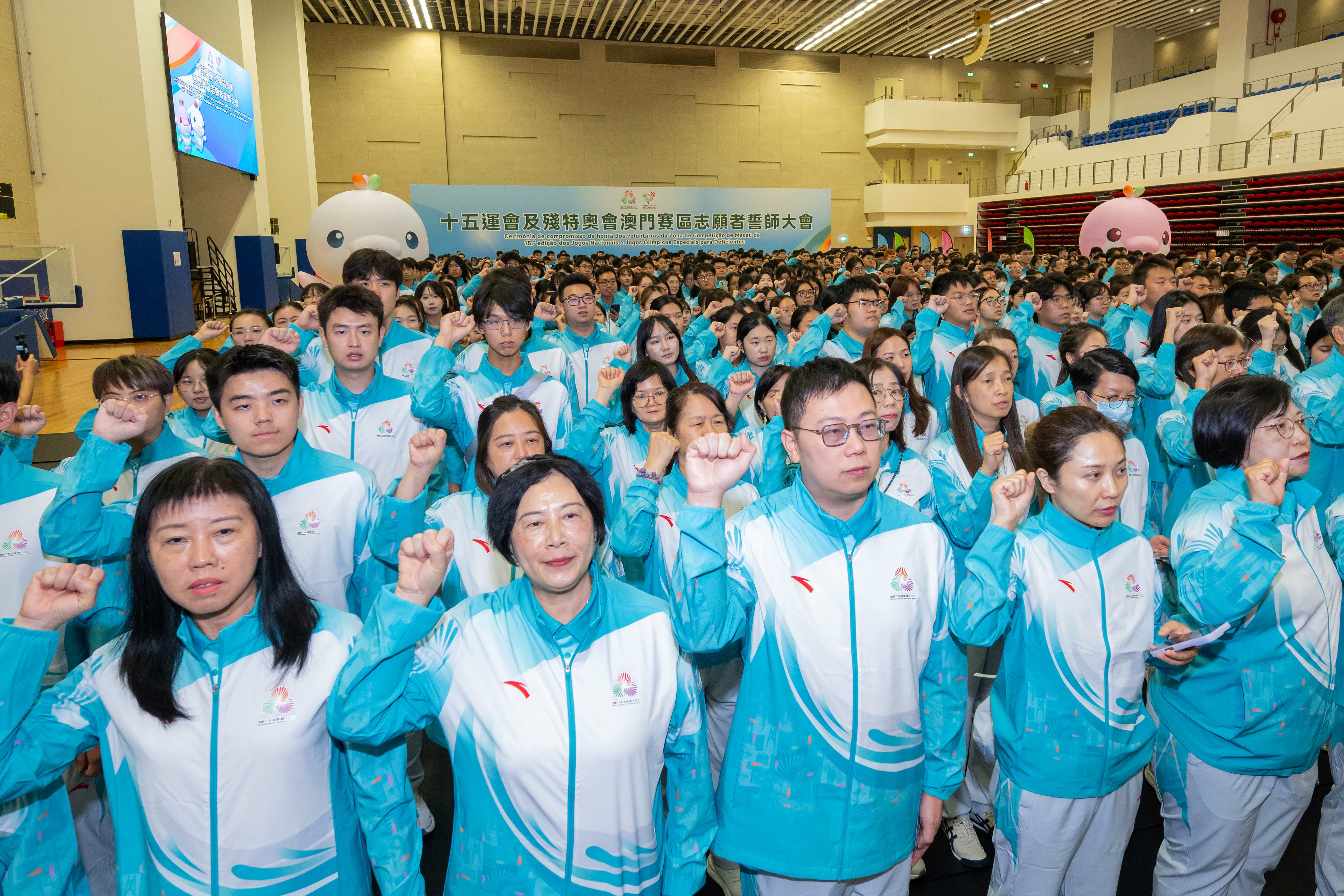 在行政長官監誓下,全場1500名志願者莊嚴宣誓,承諾盡己所能、真誠奉獻、堅守崗位、團結協作,以專業服務助力賽事,以溫暖笑容展現澳門風采,為全運澳門賽區增添光彩。活動尾聲,精彩的龍獅獻藝與歌唱表演為現場注入歡騰氣氛,授旗和宣誓儀式在喜迎盛會的熱烈氛圍中圓滿結束。