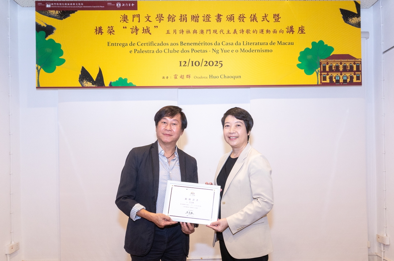 文化局持續深化澳門與大灣區城市的文化交流,搭建更廣闊的創作與展演平台,推動文學、戲劇及文化表演的跨界融合,頒贈儀式當日同時舉辦“構築‘詩城’——五月詩社與澳門現代主義詩歌的運動面向”講座,由澳門科技大學國際學院講師霍超群主講,吸引眾多市民參與,反應熱烈。霍超群在講座中聚焦五月詩社如何在多元文化背景下,融合不同詩意追求,構築獨特的“詩城”文學理想;探討詩社成員在“鼓勵創作”與“追求先鋒”之間的辯證關係,以及他們如何回應澳門城市現代性帶來的文化命題。