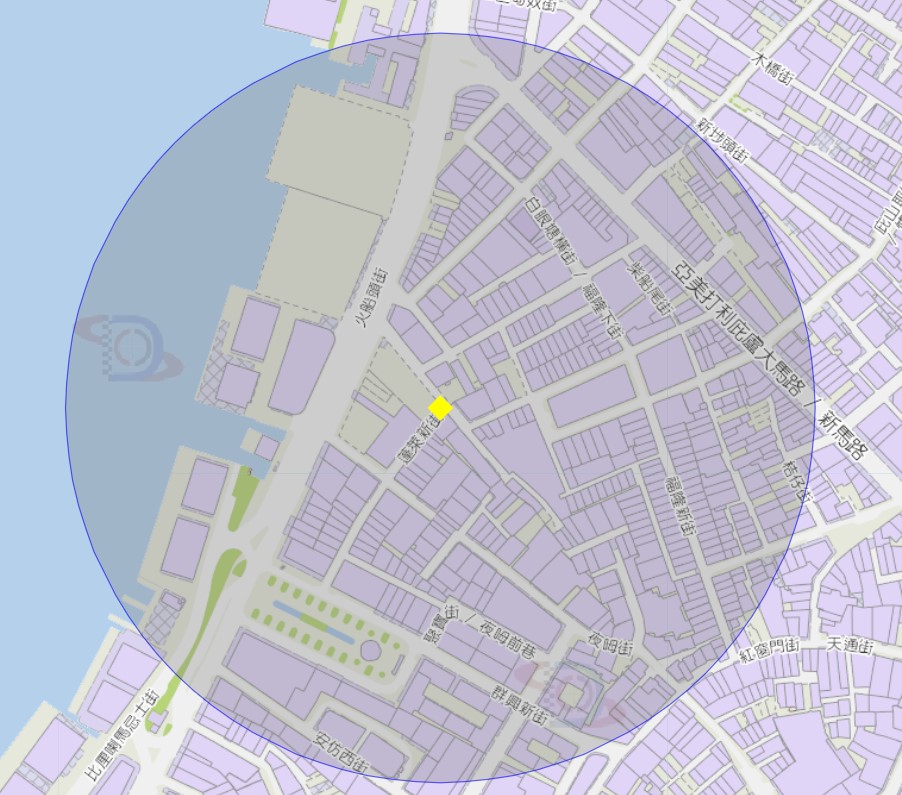 爹美刁施拿地大馬路(近新馬路一段)附近風險區域200米半徑範圍