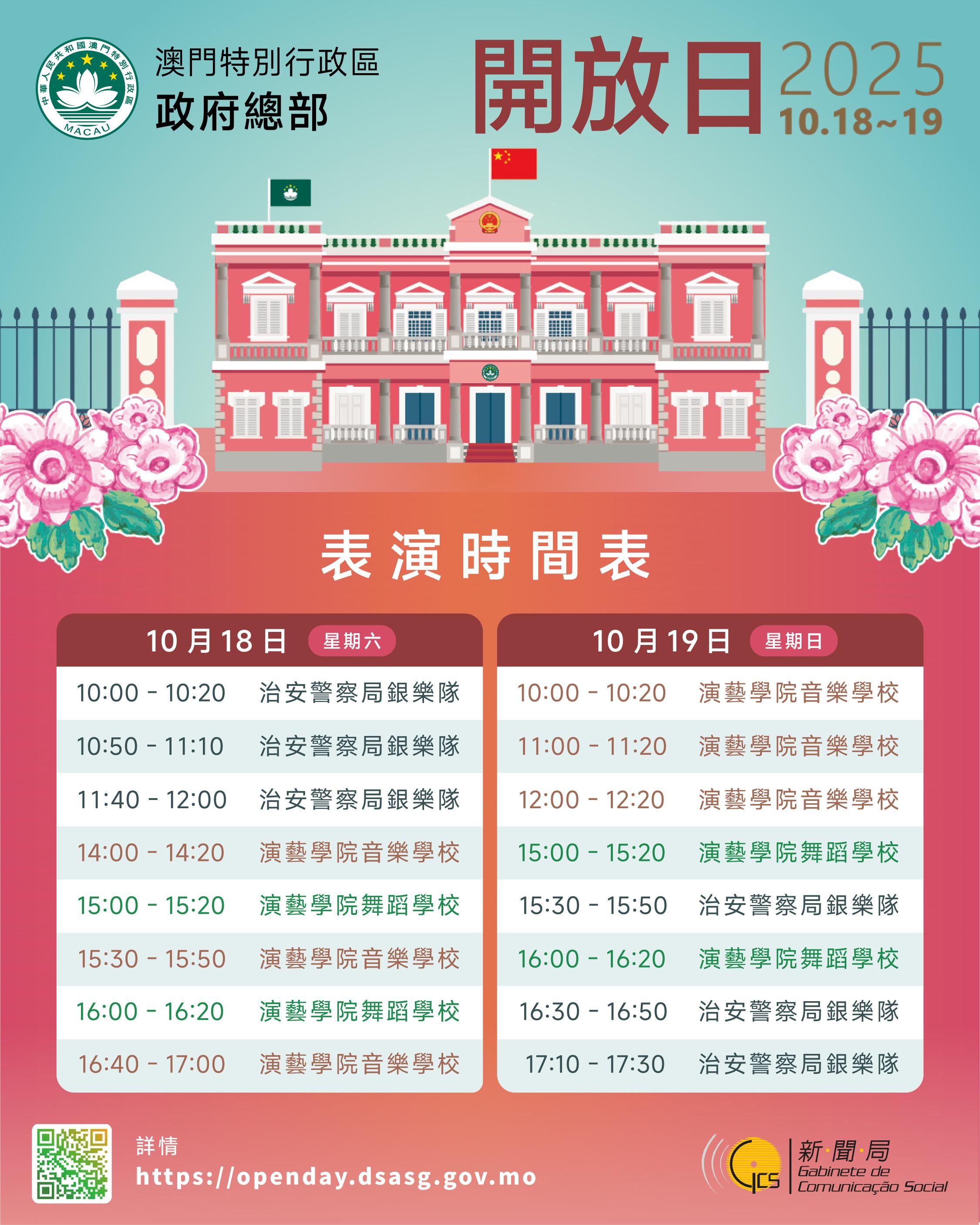 表演節目方面,治安警察局銀樂隊、演藝學院音樂學校和舞蹈學校學生將於兩天開放日的指定時段,為公眾呈獻樂器演奏及舞蹈表演。郵電局繼續在政府總部對面的南灣湖畔設置臨時櫃枱,提供加蓋紀念郵戳的服務,並發售相關郵品。