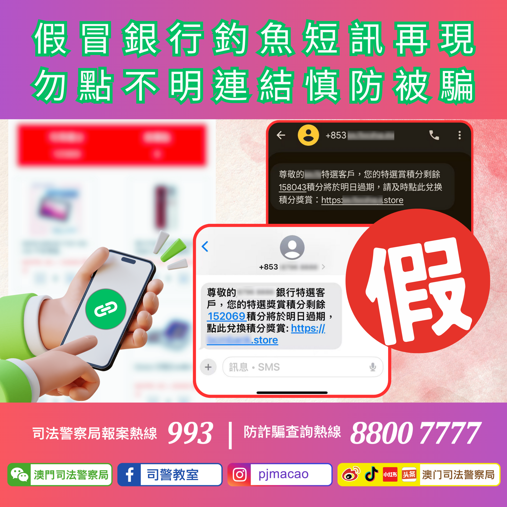 3、如有懷疑,應使用司警局“反詐程式”查核詐騙風險指數,又或致電司警局防詐騙查詢熱線88007777或報案熱線993求助。