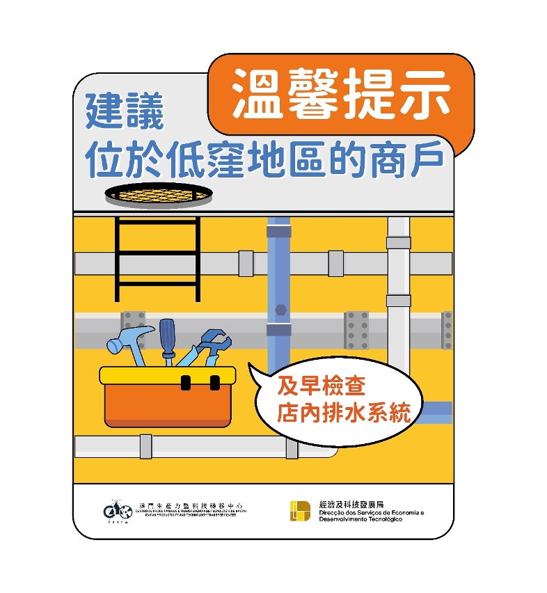 澳門生產力暨科技轉移中心與經濟及科技發展局呼籲各商戶,特別是位處低窪地區的中小企業,應密切留意氣象部門發佈的最新天氣情況,按需要及時做好防風防浸的準備工作及預防措施,以免造成貨物及設備損失。同時呼籲已安裝防浸設備的商戶,檢查防洪門閘板和配件是否齊全,熟習防洪門的安拆步驟;已安裝防浸升降台和水泵的商戶,檢查設備是否正常運作。如有疑問,應盡快向所屬的工程公司或供應商了解,做好準備,以策萬全。