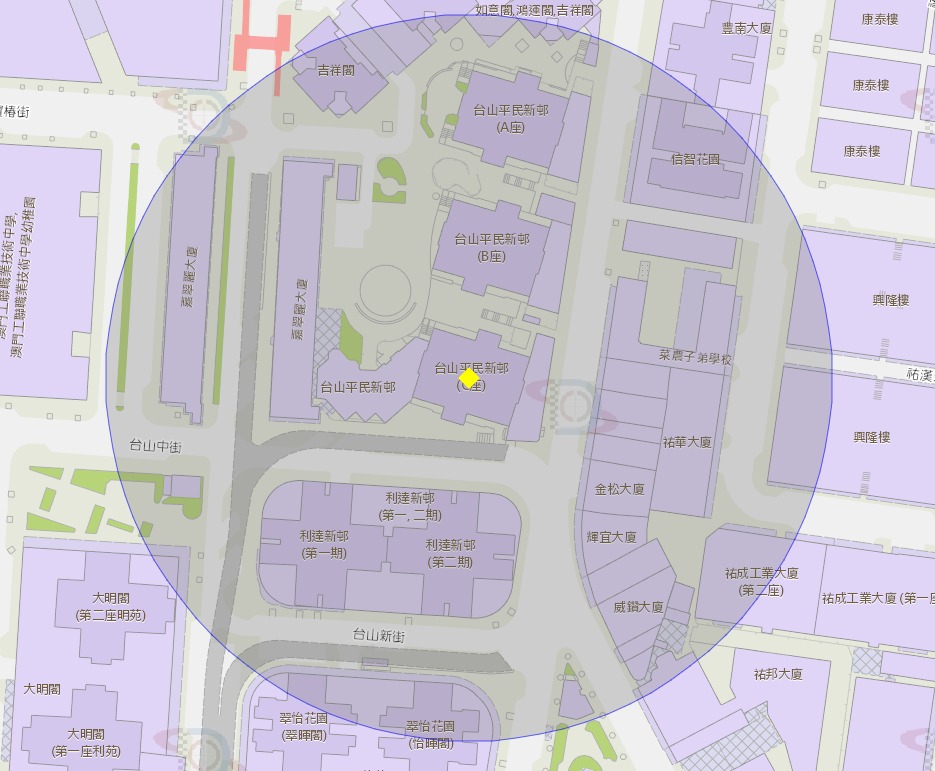 關閘馬路台山平民新邨C座附近風險區域100米半徑範圍