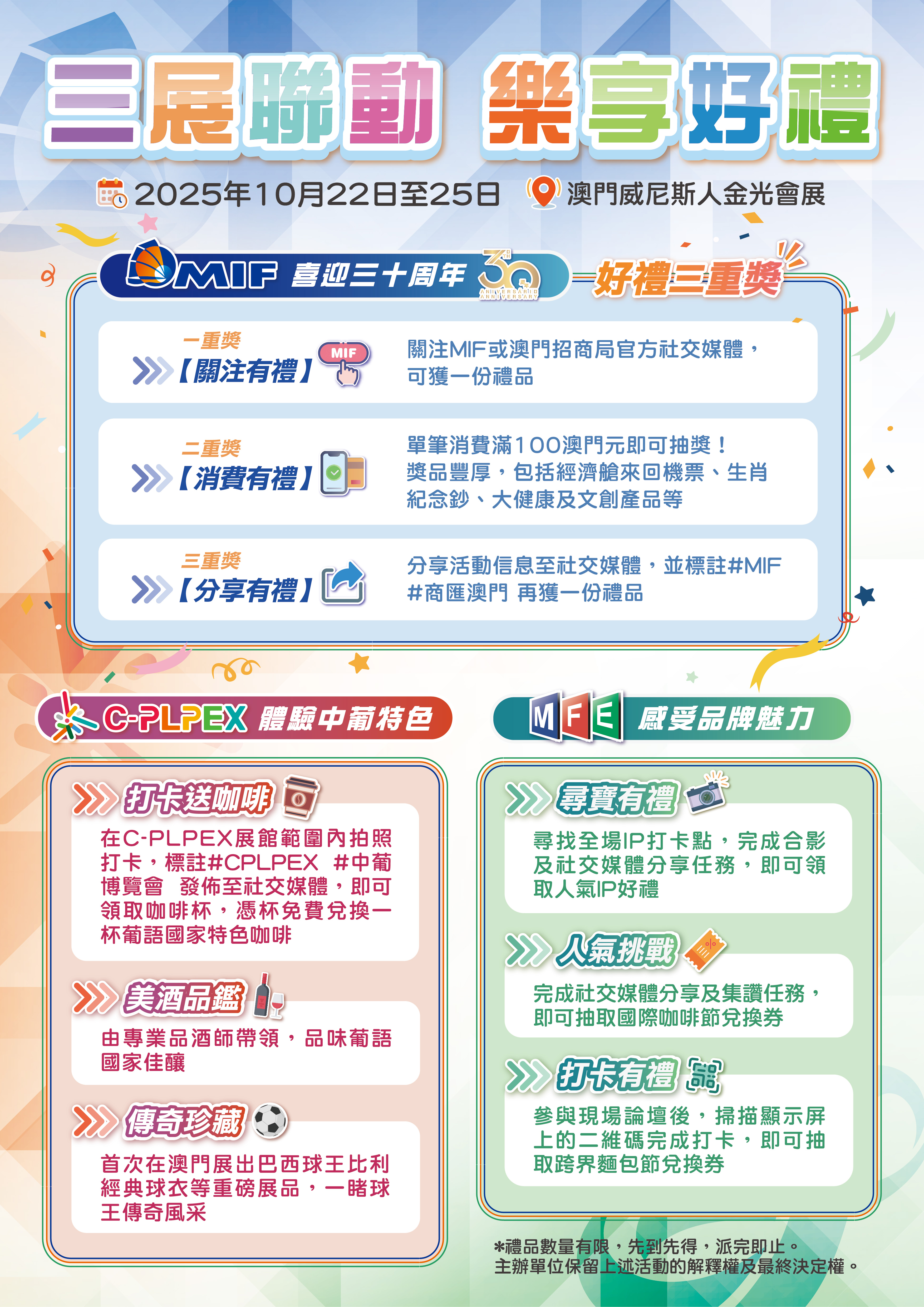 “三展”將於明(23)日起至25日,每日早上10時至下午6時在澳門威尼斯人金光會展免費對外開放。現場將派發逾3萬份精美禮品,覆蓋各展區特色好物。同時設置豐富的科技互動體驗環節,市民可與模擬機器人即時互動、試戴智能眼鏡感受前沿技術、體驗電動助力手推車的便捷設計,近距離感受智能科技在民生與產業領域的最新應用成果。同場還匯聚多個熱門品牌與特色展品,包括泡泡瑪特城市樂園、迪士尼等知名 IP 亮相,更有巴西球王比利曾穿著的珍貴球衣展出。歡迎各界客商入場探索體驗,了解中葡經貿合作、國際投資趨勢及品牌發展動態。