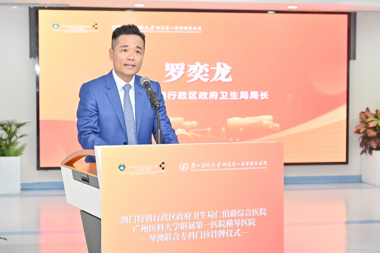 在掛牌儀式上,羅奕龍局長在致辭時表示,澳門特別行政區政府高度重視醫療衛生發展,致力透過與區域內一流醫院加強合作,促進醫療技術交流、人才培養和科研創新等,提升本澳醫療服務水平,為居民提供更優質的醫療保障。衛生局仁伯爵綜合醫院與廣醫一院橫琴醫院共同設立聯合專科門診,促進兩地規則銜接和機制對接,落實澳琴一體化發展及國家粵港澳大灣區戰略的具體體現。他指出,“琴澳聯合專科門診”以肺科及感染科為起點,建立兩院共同評估機制和設立聯合專科門診,診治經評估可由仁伯爵綜合醫院轉介的患者。該項目將充分發揮廣醫一院橫琴醫院在相關專科的專業優勢,整合兩院優質醫療資源與技術,縮短專科輪候時間,並搭建兩院醫生常態化交流平台,為青年醫生提供寶貴學習機會。
