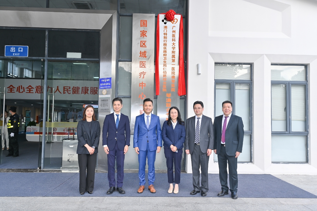 澳門特別行政區政府衛生局仁伯爵綜合醫院與廣州醫科大學附屬第一醫院橫琴醫院(下稱“廣醫一院橫琴醫院”)於今(30)日在橫琴粵澳深度合作區舉行“琴澳聯合專科門診”掛牌儀式,標誌着澳琴醫療一體化進程邁向新階段。衛生局局長羅奕龍、橫琴粵澳深度合作區民生事務局局長馮方丹、衛生局仁伯爵綜合醫院代院長戴華浩、橫琴粵澳深度合作區民生事務局副局長蘇凱慈、廣醫一院橫琴醫院院長黃錦坤、黨委書記張挪富等嘉賓出席並主持了掛牌儀式。