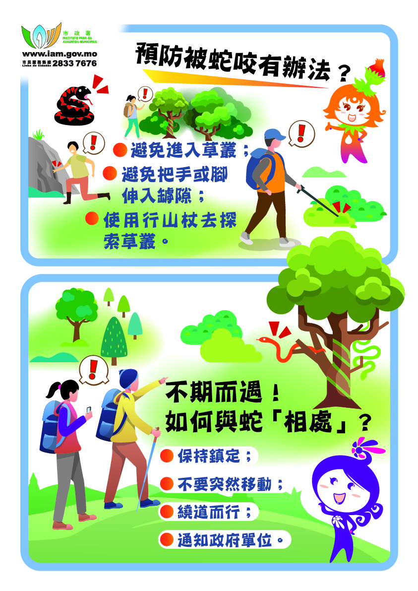 行山郊遊時如遇見蛇,應保持鎮定安靜,以免令蛇類感到受威脅。一般蛇類遇到威脅時,會作出虛張聲勢的防禦姿態,但極少主動攻擊。因此,野外遇蛇時安靜離開即可,毋須刻意將其驅離,更不要對蛇作出傷害。如不幸被蛇咬傷,應保持冷靜,與蛇保持一定距離以防再次被咬,並記錄被咬時間以及蛇的特徵,同時須避免劇烈活動,盡快求救和致電999求助。