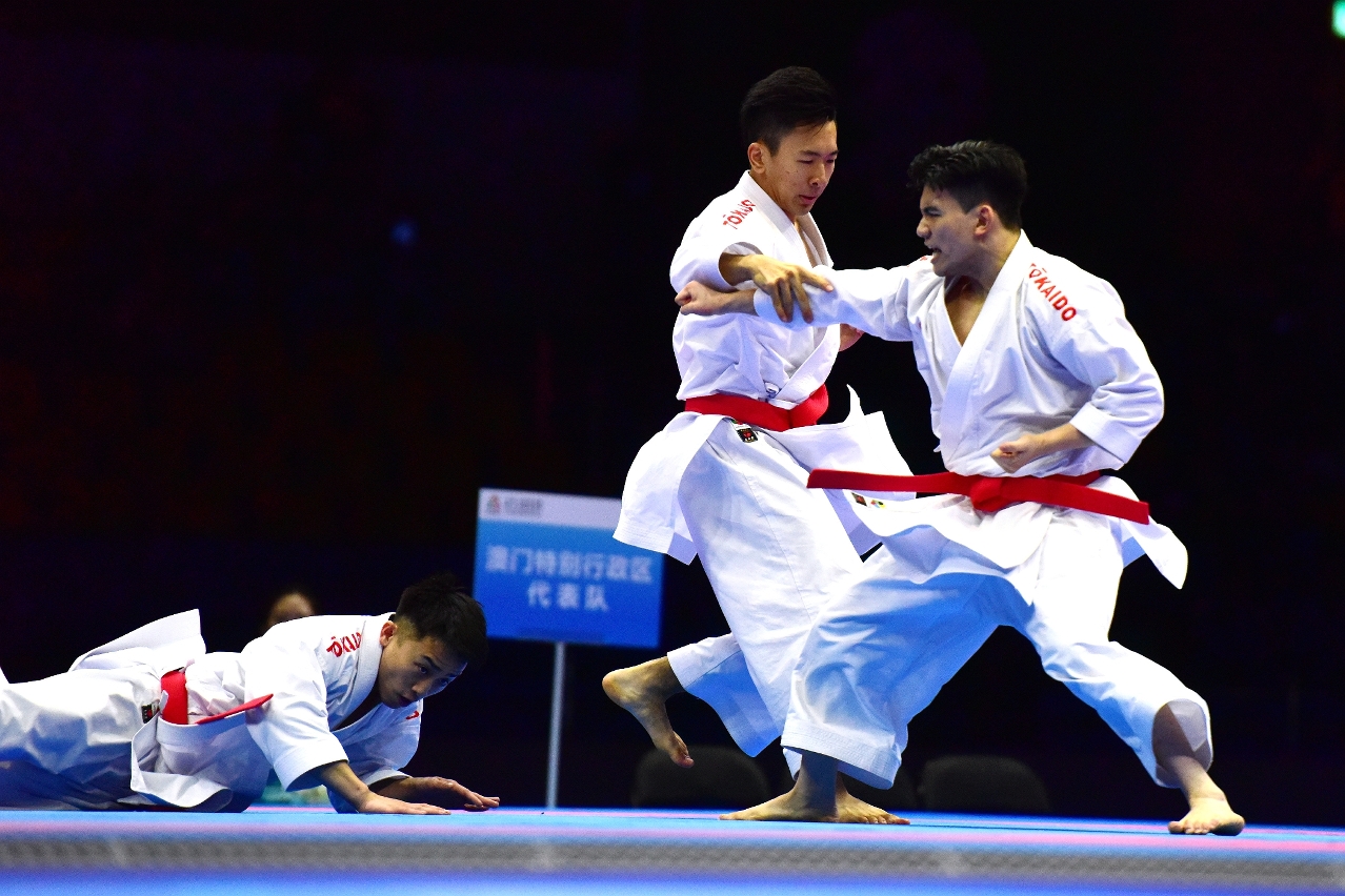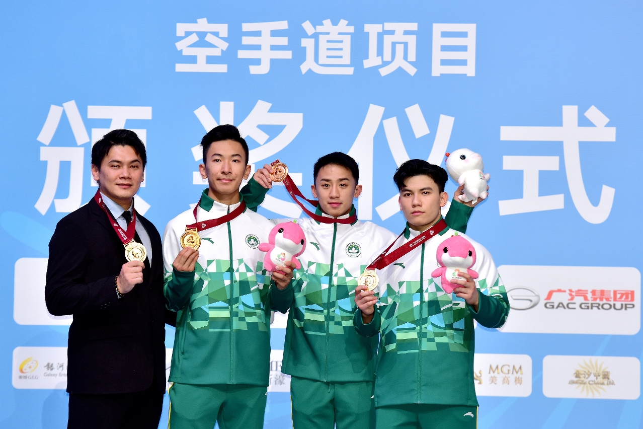 『第十五屆全國運動會』今(6)日在澳門賽區進行空手道項目,坐擁主場優勢的澳門隊首日比賽即傳來喜訊,郭建恆(KUOK KIN HANG)繼2021年西安全運會勇奪個人型銅牌,為澳門奪得歷史性獎牌後,今屆夥拍隊友鄭沘珞(CHEANG PEI LOK)及方文浩(FONG MAN HOU)在男子組團體型再造出好成績,決賽以42.7分擊敗香港隊摘金,為澳門參加全運會以來首面金牌。澳門特別行政區行政長官岑浩輝出席頒獎禮,親自為澳門運動員頒發獎牌。