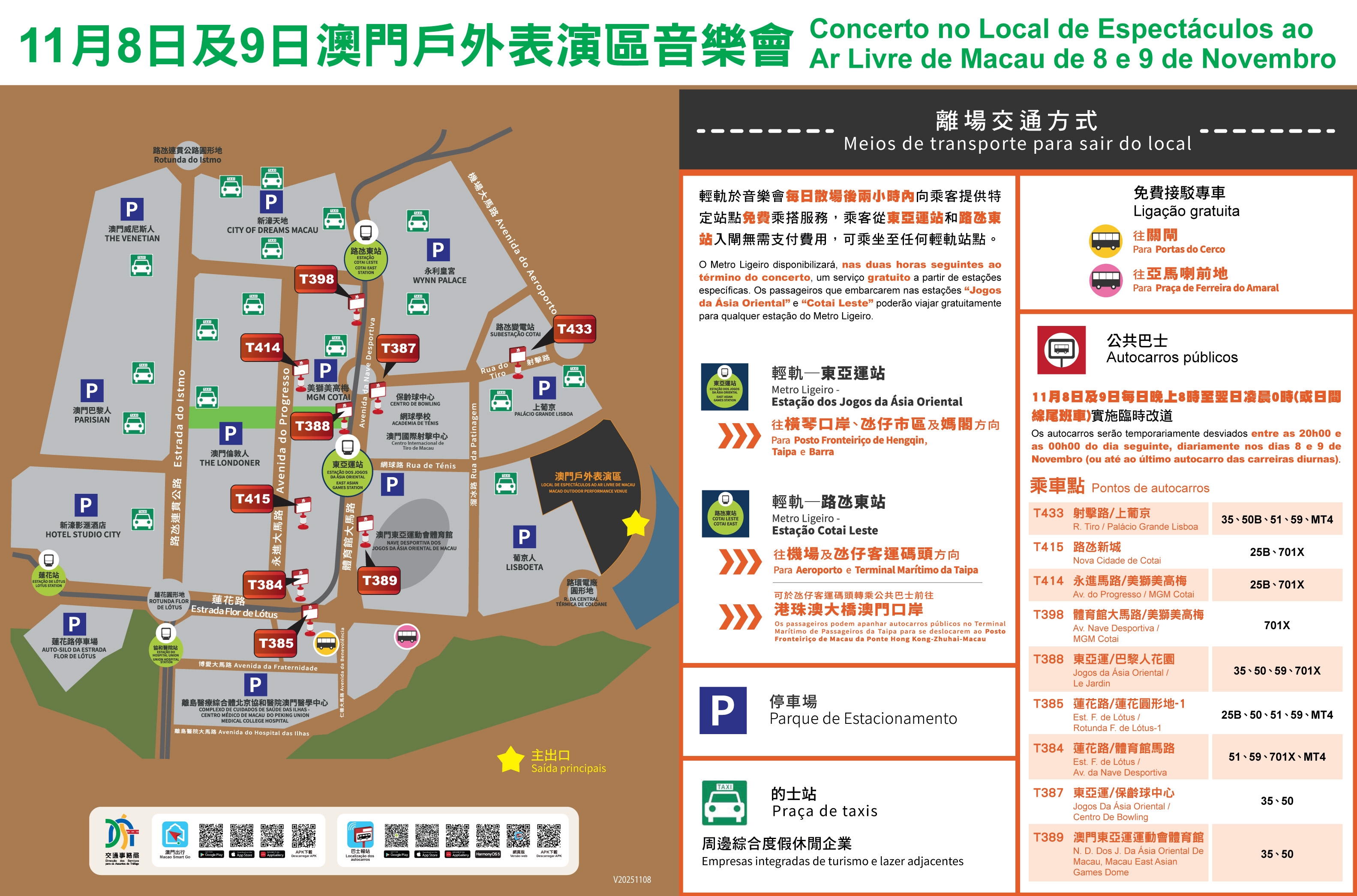2.輕軌服務:每日散場後兩小時內,從輕軌東亞運站或路氹東站入閘可免費乘搭至任何站點,尾班車為晚上11時59分,並將按情況增加班次;