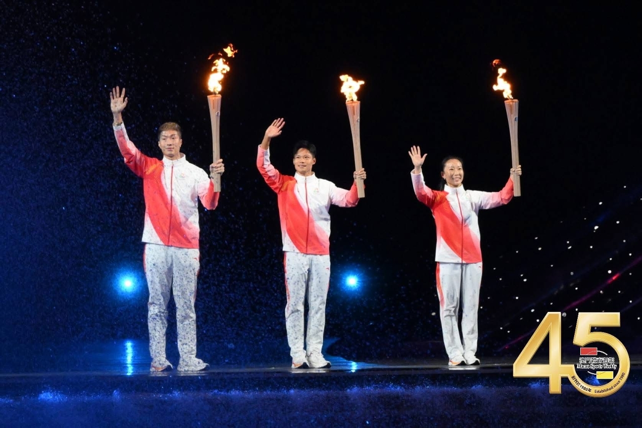 十五運會澳門首面金牌得主(空手道男子團體型金牌)、澳門理工大學體育教育學士課程學生方文浩,於開幕儀式上擔任火炬手,先在場內進行火炬傳遞,再由澳門首位亞運會女子金牌得主(女子長拳金牌)、澳門理工大學運動及體育碩士學位課程畢業生李禕,與男子 100米亞洲紀錄保持者蘇炳添和奧運會男子花劍金牌得主香港運動員張家朗,粵港澳三地運動員代表共同點燃主火炬。
