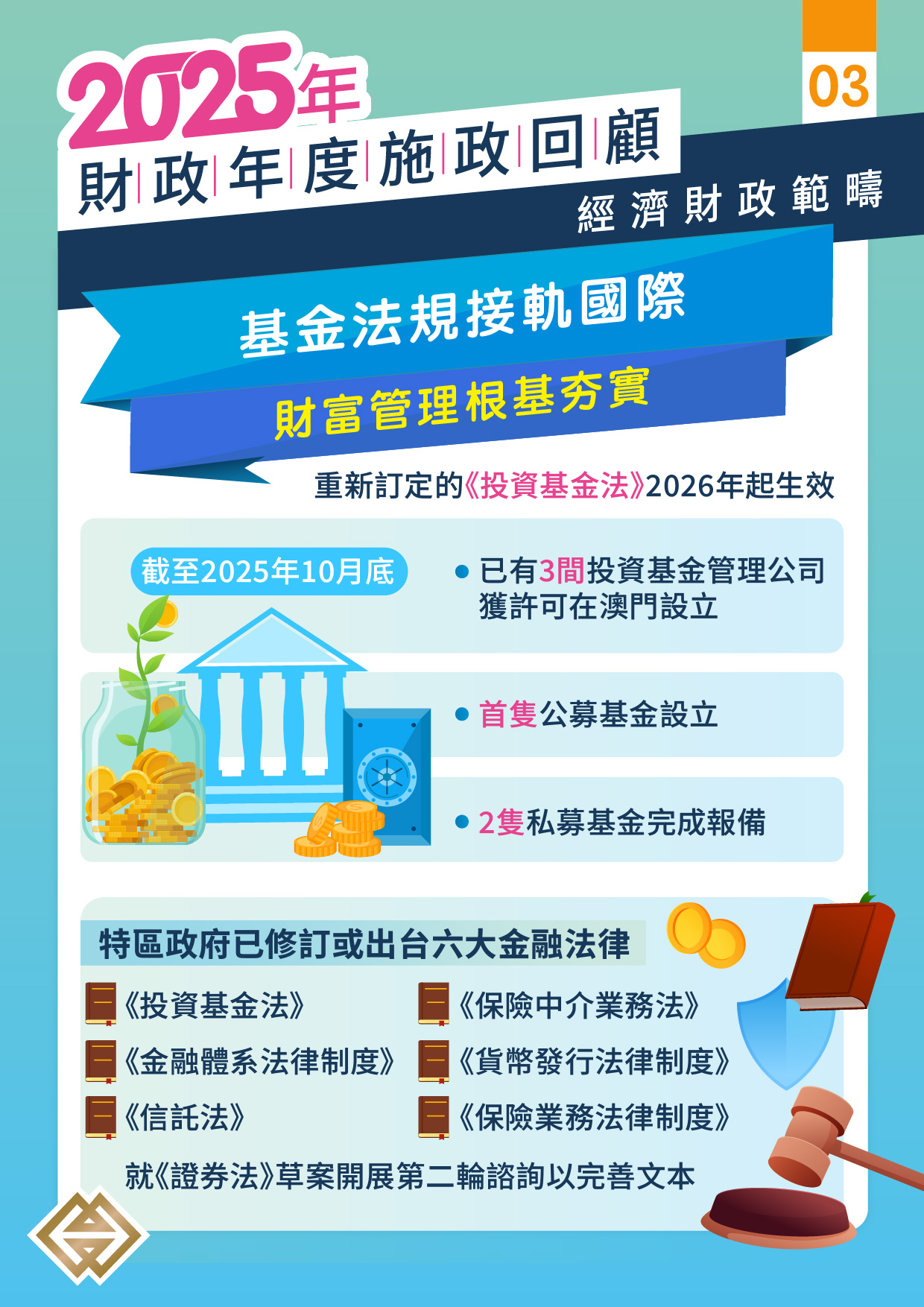 為促進財富管理市場發展,特區政府於今年7月頒佈重新訂定的《投資基金法》,並將於明年正式生效。該法律旨在加強與國際監管制度的接軌、提高對投資者的保護、增加投資工具的多樣性、移除基金管理運作和發展的障礙,以及優化基金投資及管理的環境。目前,已有三間投資基金管理公司獲許可在澳門設立,首隻公募基金已在澳門設立,另有2隻私募基金完成報備。