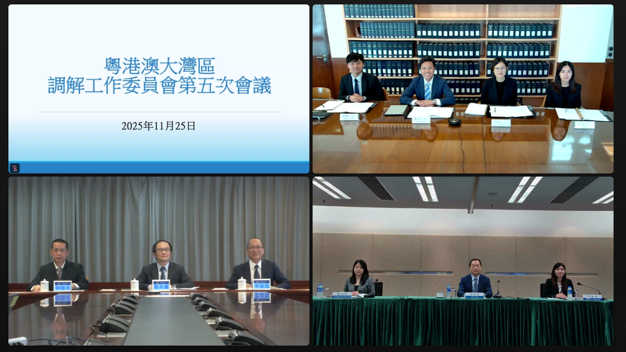 粵港澳大灣區調解工作委員會於今(25日)以視像方式舉行第五次會議,澳門特區政府法務局副局長邱顯哲、廣東省司法廳黨委委員、副廳長陳永康、香港特區政府律政司署理民事法律專員戴思勁等出席。