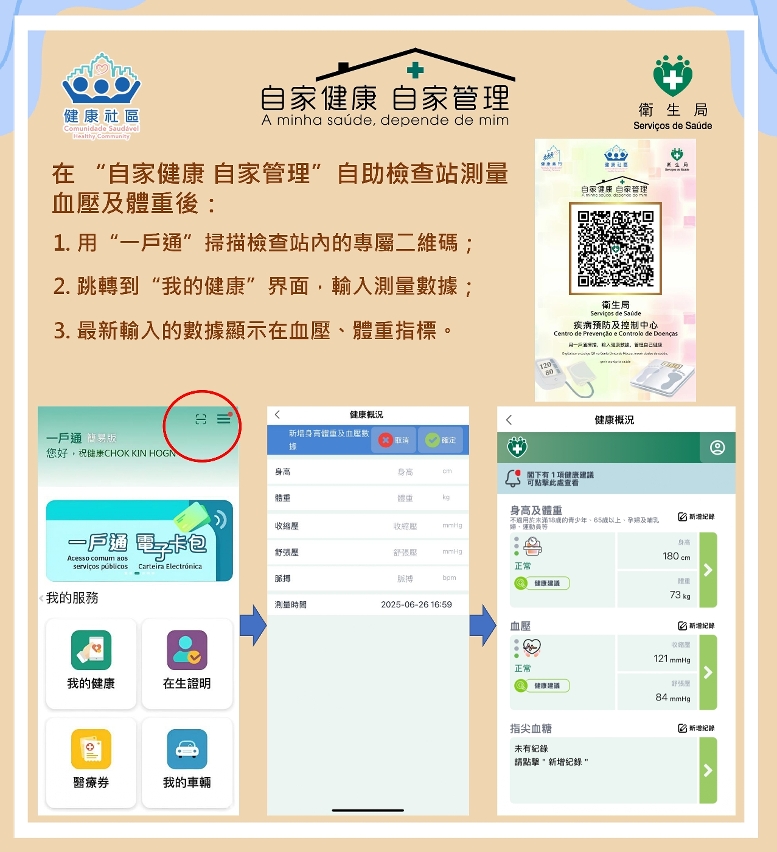 為推動居民主動監測自己的健康狀況,便利居民自助檢查體重和血壓,衛生局自2015年起設立“自家健康,自家管理”自助檢查站,截至目前已增至146個,覆蓋醫療機構、街市、熟食中心、圖書館、活動中心、體育場館、藥房、銀行等公共場所。2024年使用人次約160萬,使用人數約10萬,顯示計劃成效顯著。2026年檢查站數量將擴展至200個,涵蓋健康企業、健康校園、政府部門等,並將增設結合身體檢查及心理評估功能的一體式自助檢查機,優先設於社區活動中心、熟食中心和24小時政府服務中心,並加強宣傳,製作檢查站互動地圖、設備操作短片等。