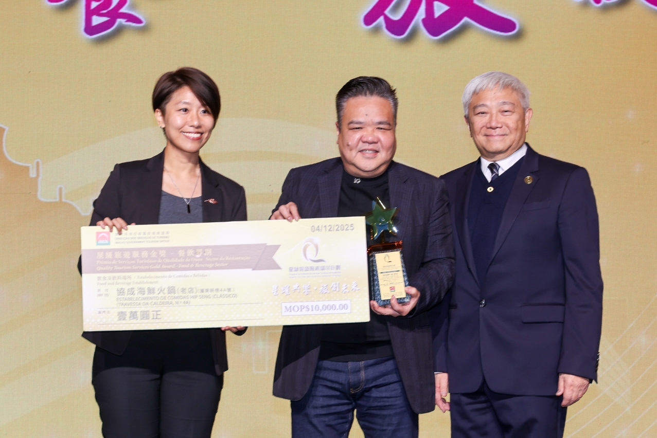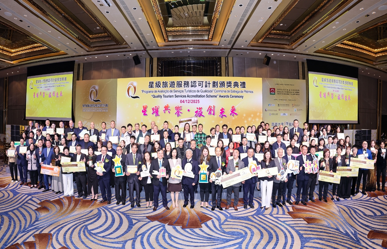 旅遊局於今(4)日舉辦2025年度“星級旅遊服務認可計劃”餐飲及旅行社界別的頒獎典禮,嘉許本年度新參加及再次競逐的獲獎餐飲及旅行社商戶。今年獲得“星級旅遊服務商戶獎”的餐飲界別共有327間,旅行社界別有57間,鼓勵澳門旅遊業界提供優質旅遊服務,共同打造澳門成為有禮優秀的旅遊目的地。