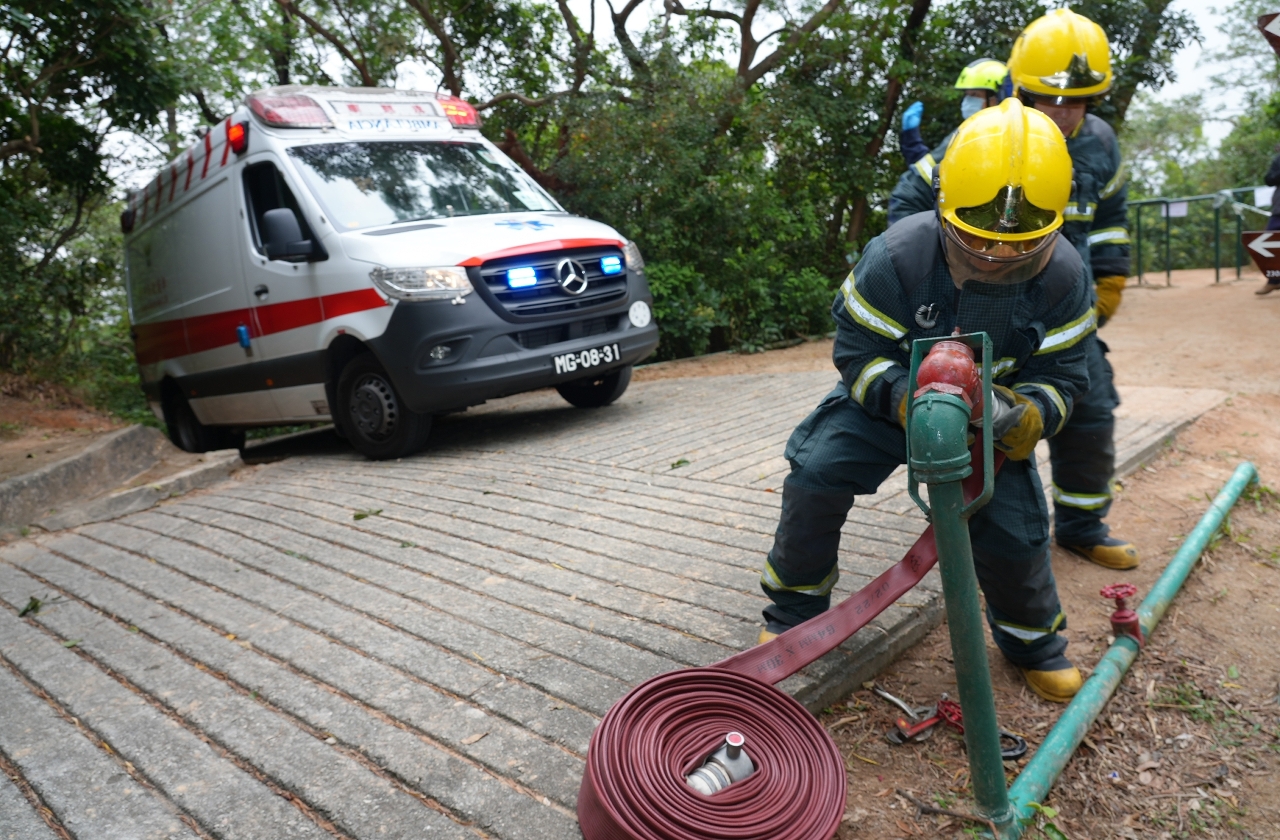 為加強山林消防安全,提高在發生事故時的應變及協調溝通能力,消防局於2025年12月4日上午,聯同市政署及治安警察局,在路環九澳高頂馬路家樂徑位置進行山火應急聯合演習。
