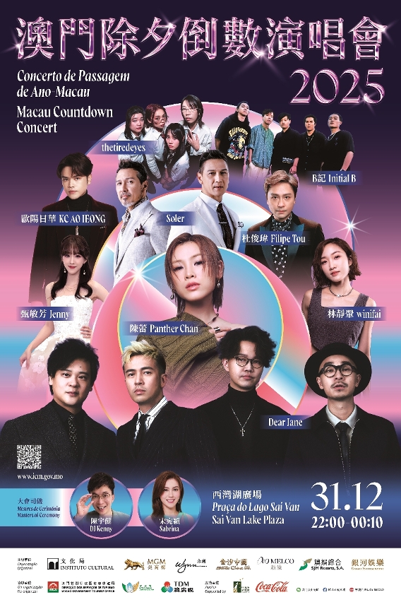 為與市民旅客共迎新年,“2025澳門除夕倒數演唱會”和“2025氹仔除夕倒數晚會”將於12月31日晚上,分別在澳門西灣湖廣場和氹仔龍環葡韻舉行。香港著名歌手陳蕾、樂隊Dear Jane、湯寶如,以及多位本澳歌手、樂隊將分別於澳門及氹仔傾力演出,營造濃厚的節日氛圍。其中“澳門除夕倒數演唱會”在倒數環節將不會安排煙花表演,敬請市民及旅客留意。