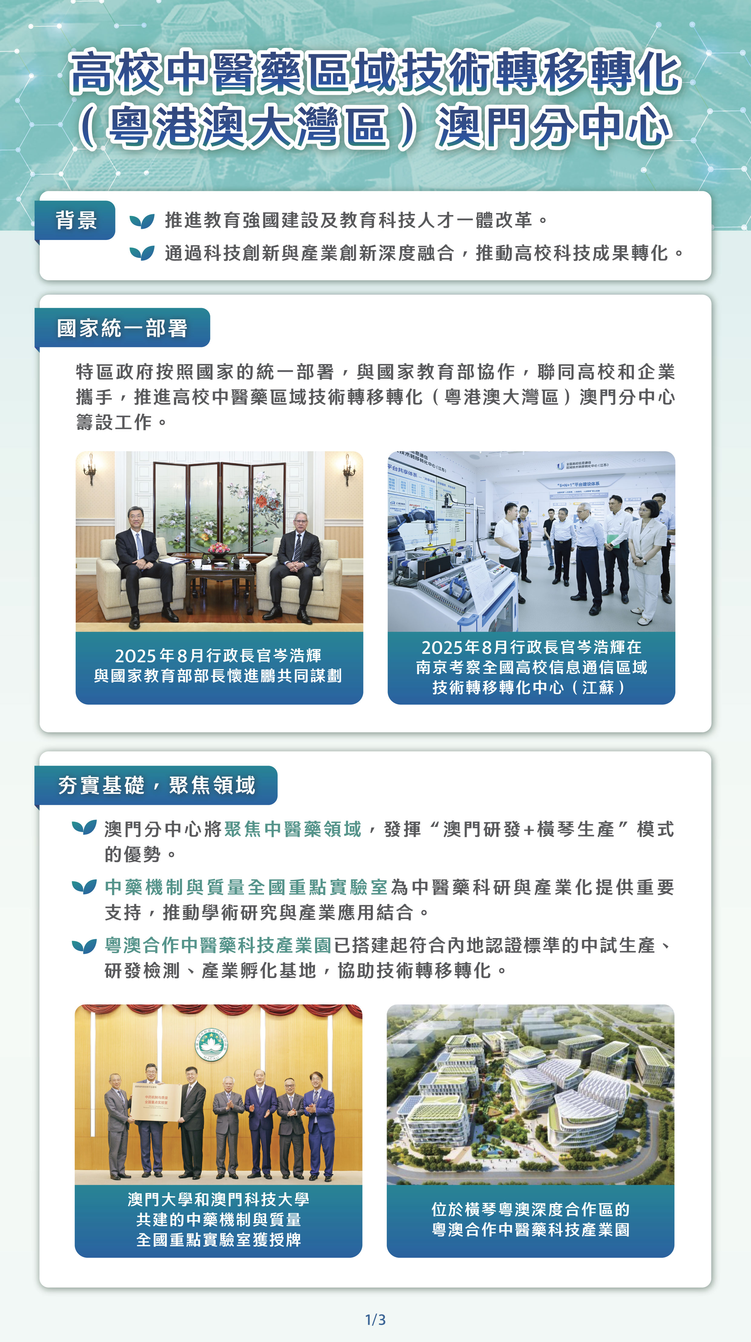 特區政府按照2026年施政方針部署,圍繞“四大建設項目”,於2025年12月12日下午在橫琴粵澳深度合作區(下稱“合作區”)進行澳門大學合作區校區動工儀式(下稱“澳大動工儀式”)及於澳琴兩地進行高校中醫藥區域技術轉移轉化(粵港澳大灣區)澳門分中心啟動儀式(下稱“澳門分中心啟動儀式”)。