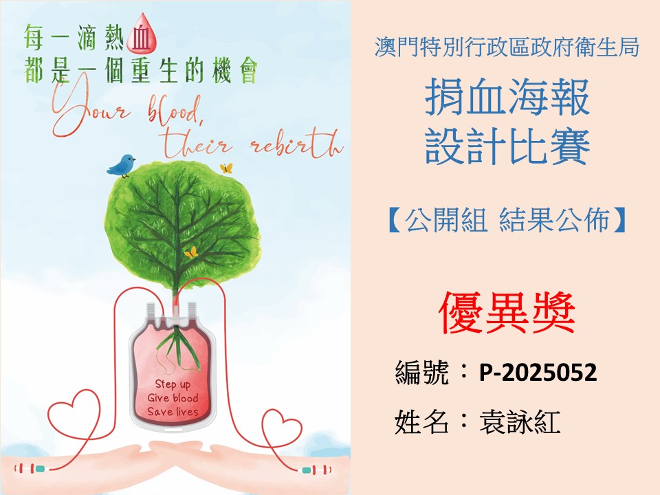 為推廣無償捐血理念,促進社會各界關注和支持本澳捐血事宜,衛生局在本年度5月19日至8月15日期間舉辦“捐血海報設計比賽”,獲得公眾及學生群體踴躍參與。比賽評審工作在多位專家指導下順利完成,並分別甄選出公開組及學生組冠、亞、季軍等多個獎項。