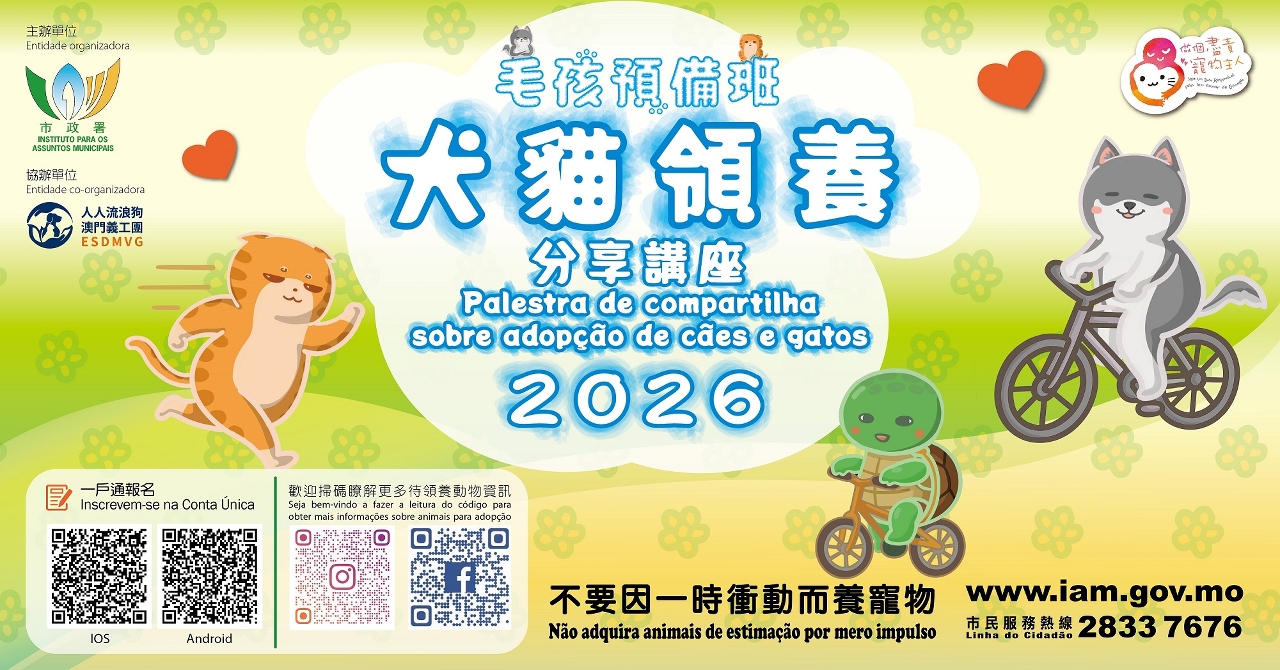 講座由市政署及人人流浪狗澳門義工團合辦,將介紹澳門市政狗房的領養服務、養寵家居安全設置、醫療護理常識,以及《動物保護法》法律知識等,並將分享犬貓領養成功故事,宣揚做個盡責寵物主人及尊重動物生命的理念。講座後,有意領養人士將由獸醫帶領前往澳門市政狗房參觀,與待領養動物互動,並留下領養意向等資訊。