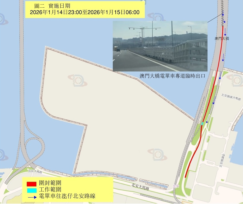 - 2026年1月13日晚上11時至翌日上午6時,氹仔北安往澳門A區的電單車引橋將臨時封閉,電單車駕駛者可經北安大馬路使用澳門大橋汽車車道上橋後,再駛入電單車專道前往澳門A區。(詳見圖1)