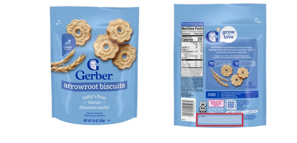 涉事嬰幼兒餅乾產品名稱為“Arrowroot biscuits”,品牌為Gerber,重量為5.5安士(155克),涉及產品批次的資料如下: