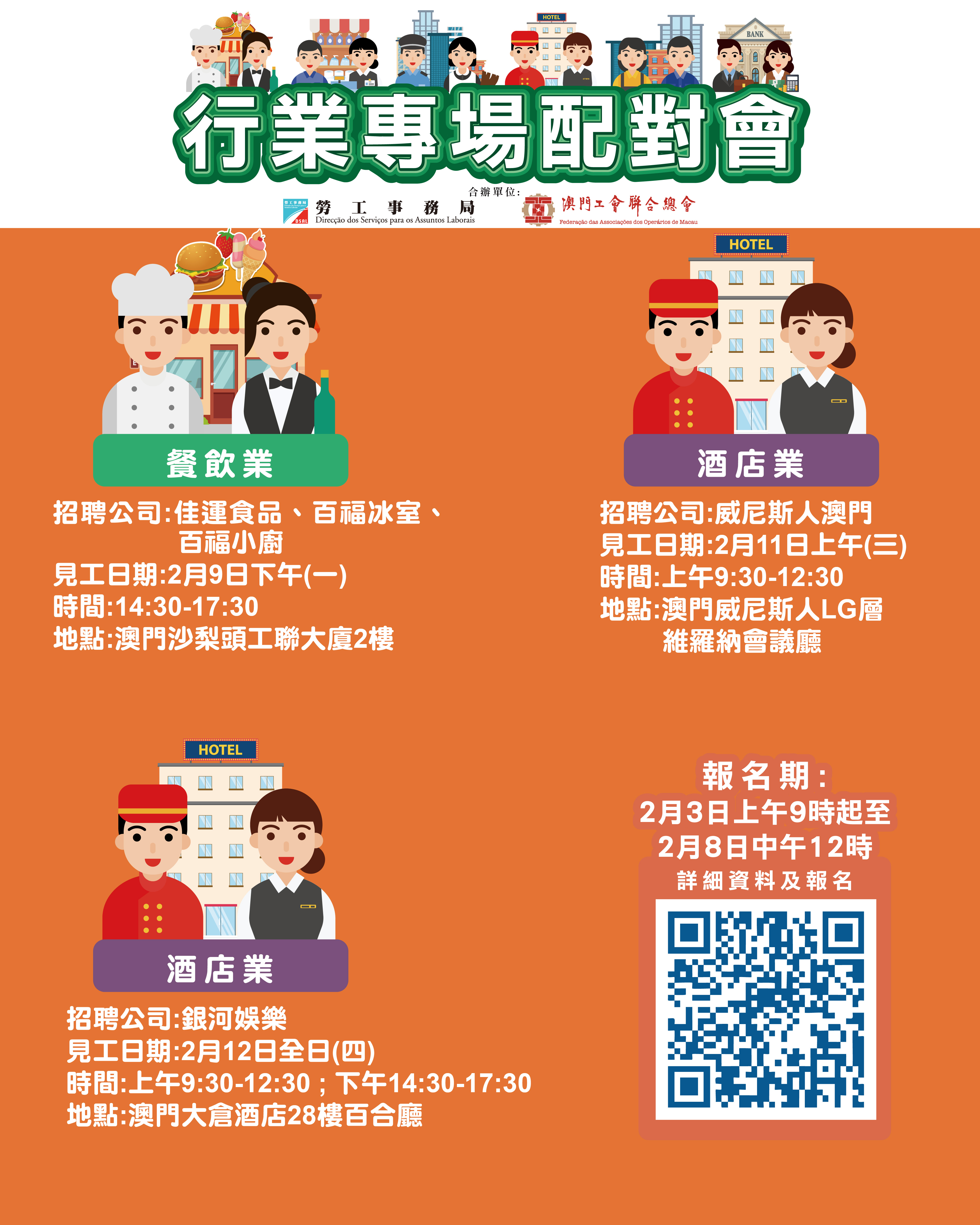 2月9日下午餐飲業專場配對會在澳門沙梨頭海邊街2-6號工聯大廈二樓舉行; 2月11日上午酒店業專場配對會在澳門威尼斯人LG層維羅納會議廳舉行;2月12日全日酒店業專場配對會在澳門大倉酒店28樓百合廳舉行。報名日期均由明(3)日上午9時起至2月8日中午12時。