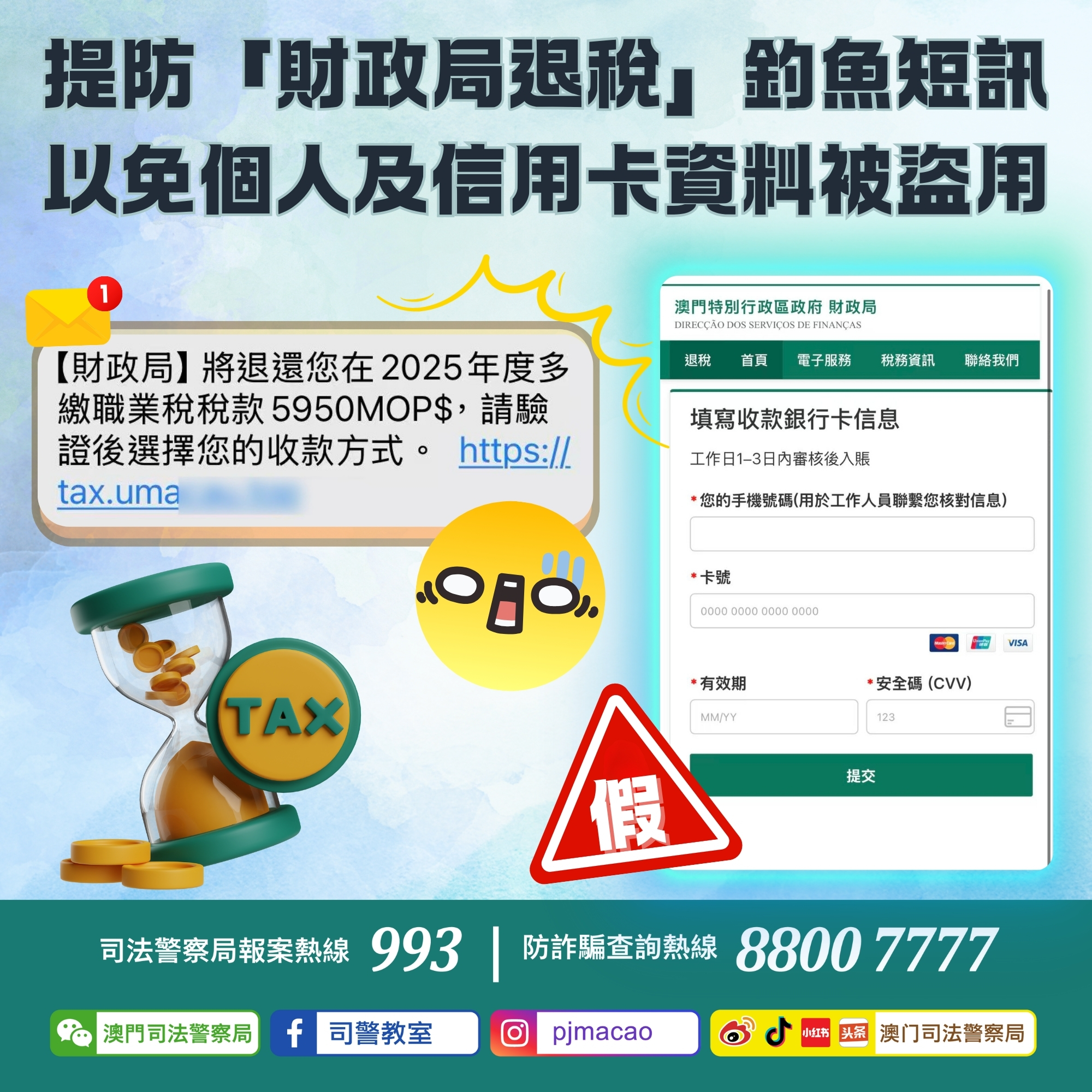 司警局呼籲提防「財政局退稅」釣魚短訊 以免個人及信用卡資料被盜用