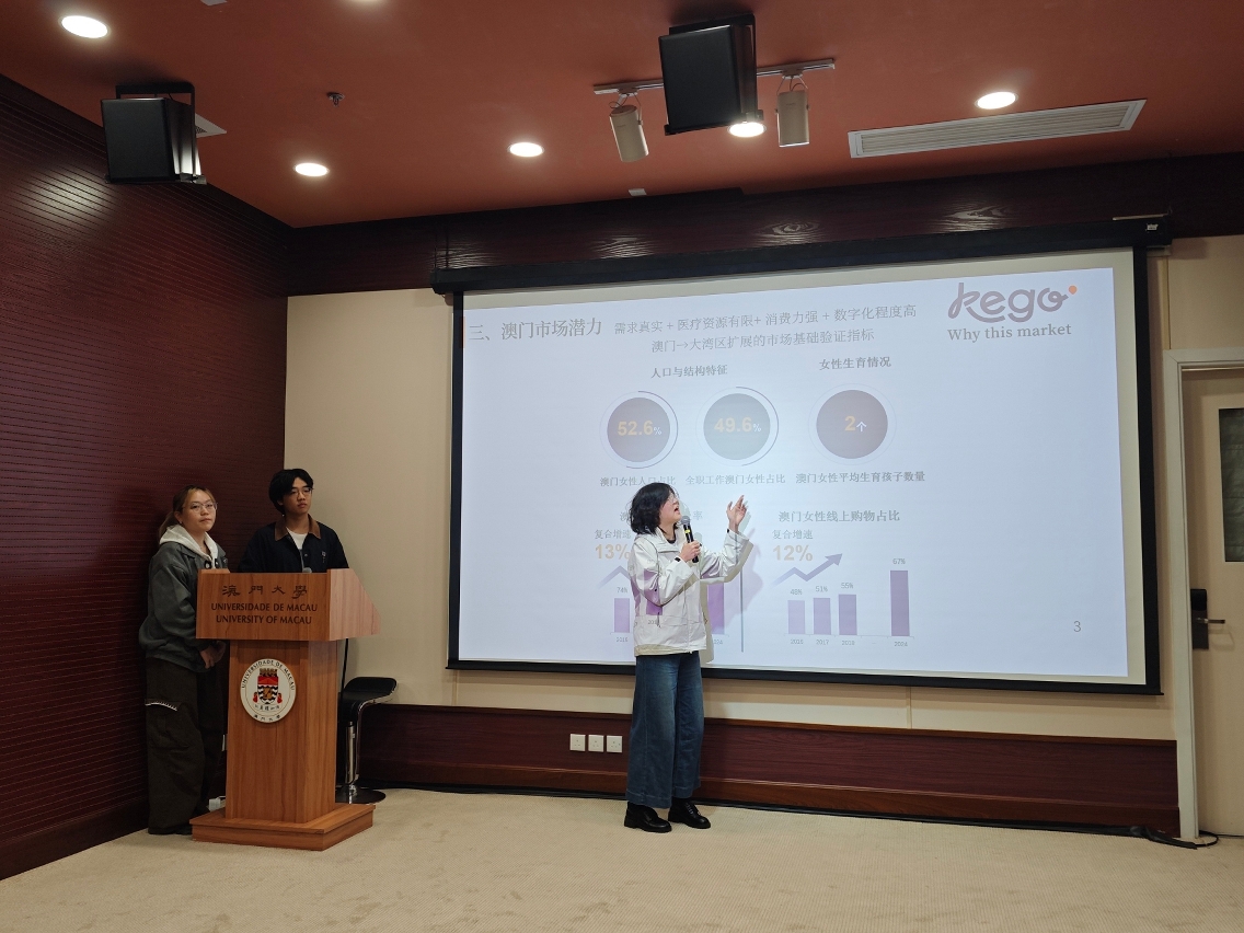 培訓營的學員以不同的創業項目進行比拼,並由黃承發、前澳門啤酒總經理洪漢杰、香港理工大學應用物理學系高級講師詹國龍等多位企業代表及專業人士,從創新性、市場潛力、技術可行性、社會價值等方面進行綜合評估。最終,由澳大工商管理學院、鄭裕彤書院學生楊楊、盧讓嘉誠,以及香港理工大學應用物理系學生周致組成的Kego 組所提交的智能盆底肌訓練系統項目,憑藉清晰的市場定位及實用價值獲得冠軍,並贏得由工銀澳門贊助的 4,000 澳門元現金獎。該項目聚焦女性健康領域,推動盆底肌修復產品在澳門市場的應用與普及,回應女性在產後康復及健康管理方面的實際需求,展現了創業項目結合社會議題與市場導向的潛力。