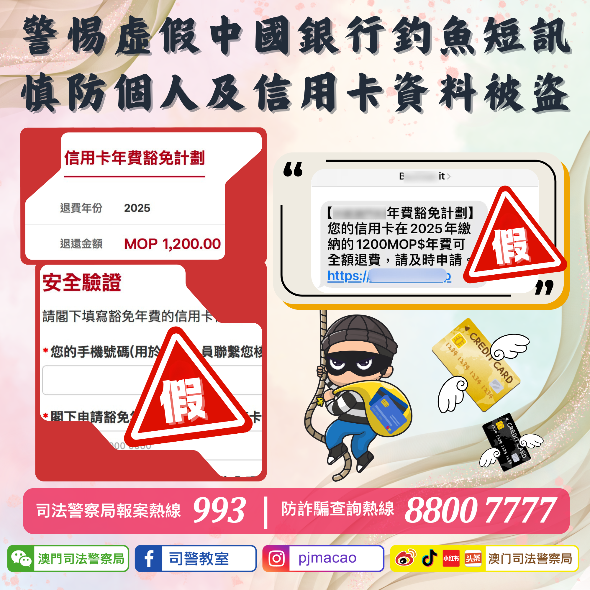 司法警察局發現近日再有騙徒向市民發送釣魚短訊,假冒中國銀行名義虛構信用卡「年費豁免計劃」,訛稱市民信用卡「已繳納的$1200MOP年費可全額退費」,以此誘騙市民點擊短訊內之連結,伺機盜取市民個人及信用卡資料進行未經授權的大額交易。