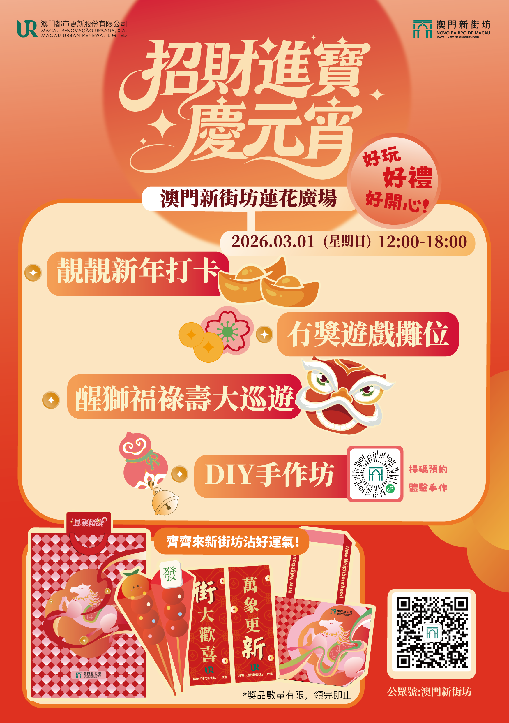 • 澳門新街坊本周日(3月1日)舉辦元宵活動,備有精彩節目和豐富獎品,與民同樂,共慶佳節。