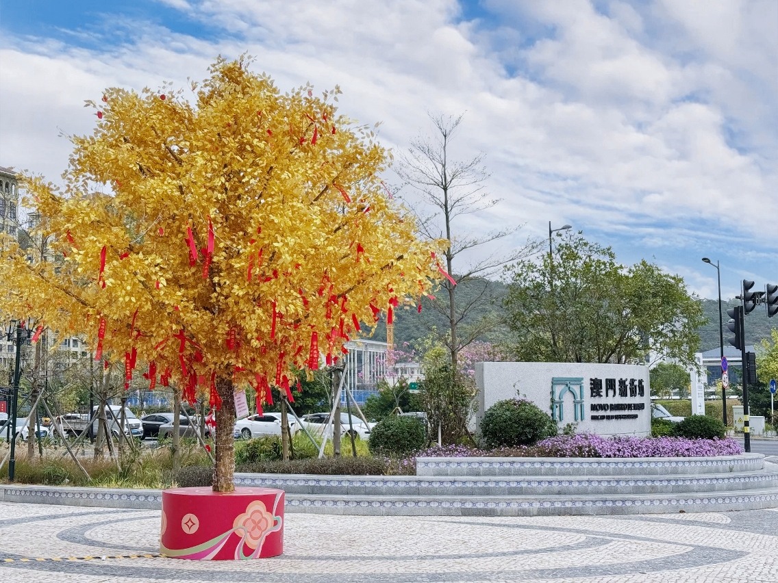 澳門新街坊呈獻多款「好意頭」的互動打卡裝置,向居民們送上節日祝福。當中必到打卡點是巨型「黃金發財樹」,樹身滿佈黃金樹葉,寓意招財進寶、豐足美滿,市民可將寄托心願的紅絲帶拋擲到樹上許願,打卡互動更可享揮春或利是封套裝一份。