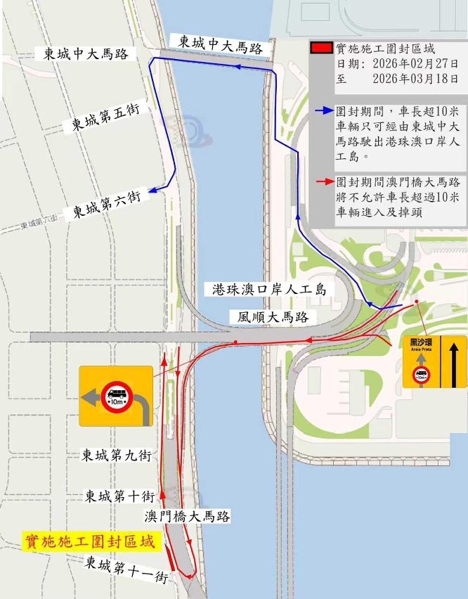 為配合新城填海區A區共同管道及道路設計連建造工程-南區項目推進,需於澳門橋大馬路與東城第十一街的交界處進行下水道建造及接駁工作,因此,鄰近東城第十一街的一段澳門橋大馬路將於2月27日至3月18日實施有限度通車,期間部份路段將收窄(詳見附圖);超過10米長之車輛禁止駛入風順大馬路,相關車輛只可經由東城中大馬路駛出港珠澳人工島往A區,敬請駕駛者留意現場指示及禮讓駕駛。