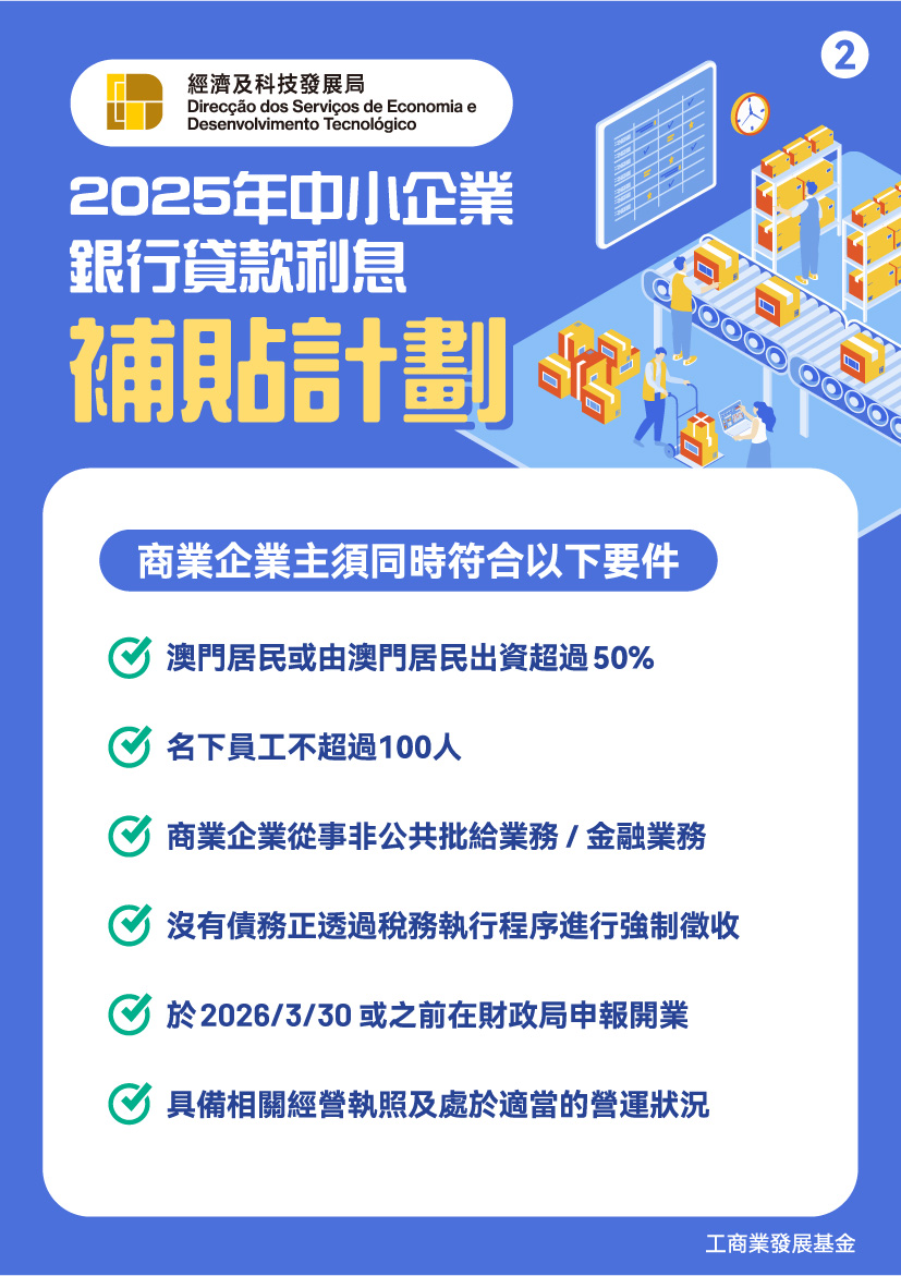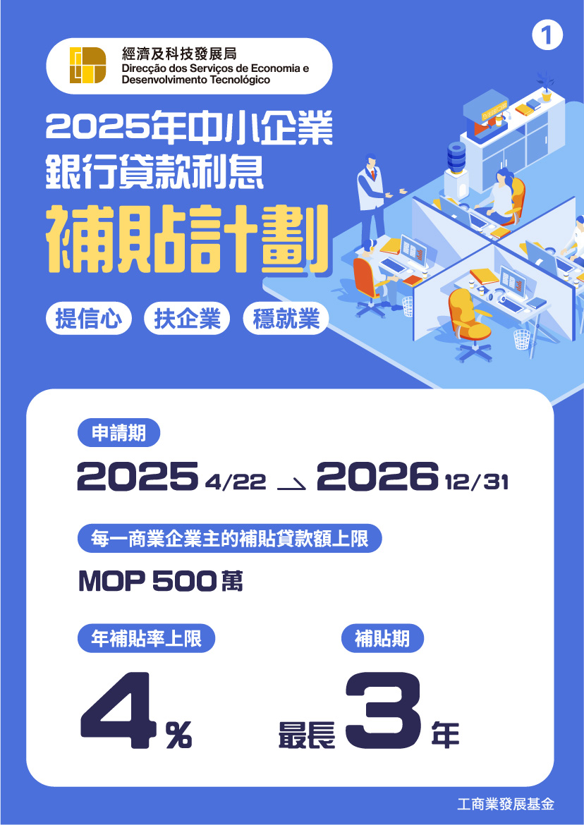 “2025利息補貼計劃”詳情可瀏覽經科局網頁(https://www.dsedt.gov.mo/zh_MO/web/public/pg_sme_bjcf)。如有任何查詢,可電郵至bjf@dsedt.gov.mo,亦可於辦公時間致電2888 2088或透過微信服務號“DSEDTONLINE”與經科局聯繫。