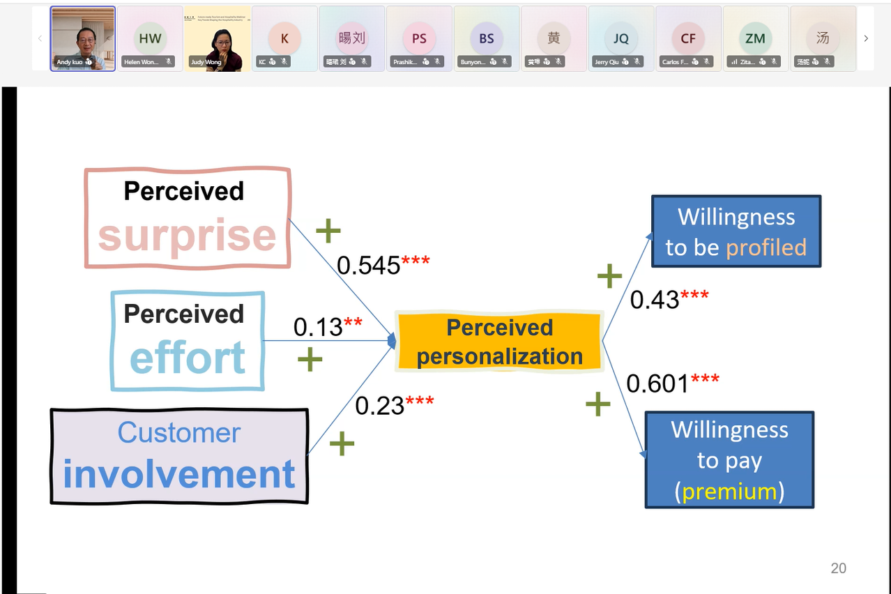 郭振峯博士首先介紹服務個性化的分析框架,指出“讓客人感受到被個別重視”才是提升滿意度、忠誠度及付費意願的關鍵驅動因素。他提出“個性化四象限模型”,以顧客所感知的投入程度與驚喜程度來分類服務互動。此外,他亦建議採用DART框架(對話、取用、風險、透明度)作為個性化體驗共創工具,協助酒店在整個住宿旅程中與客人建立更深層次的互動關係。