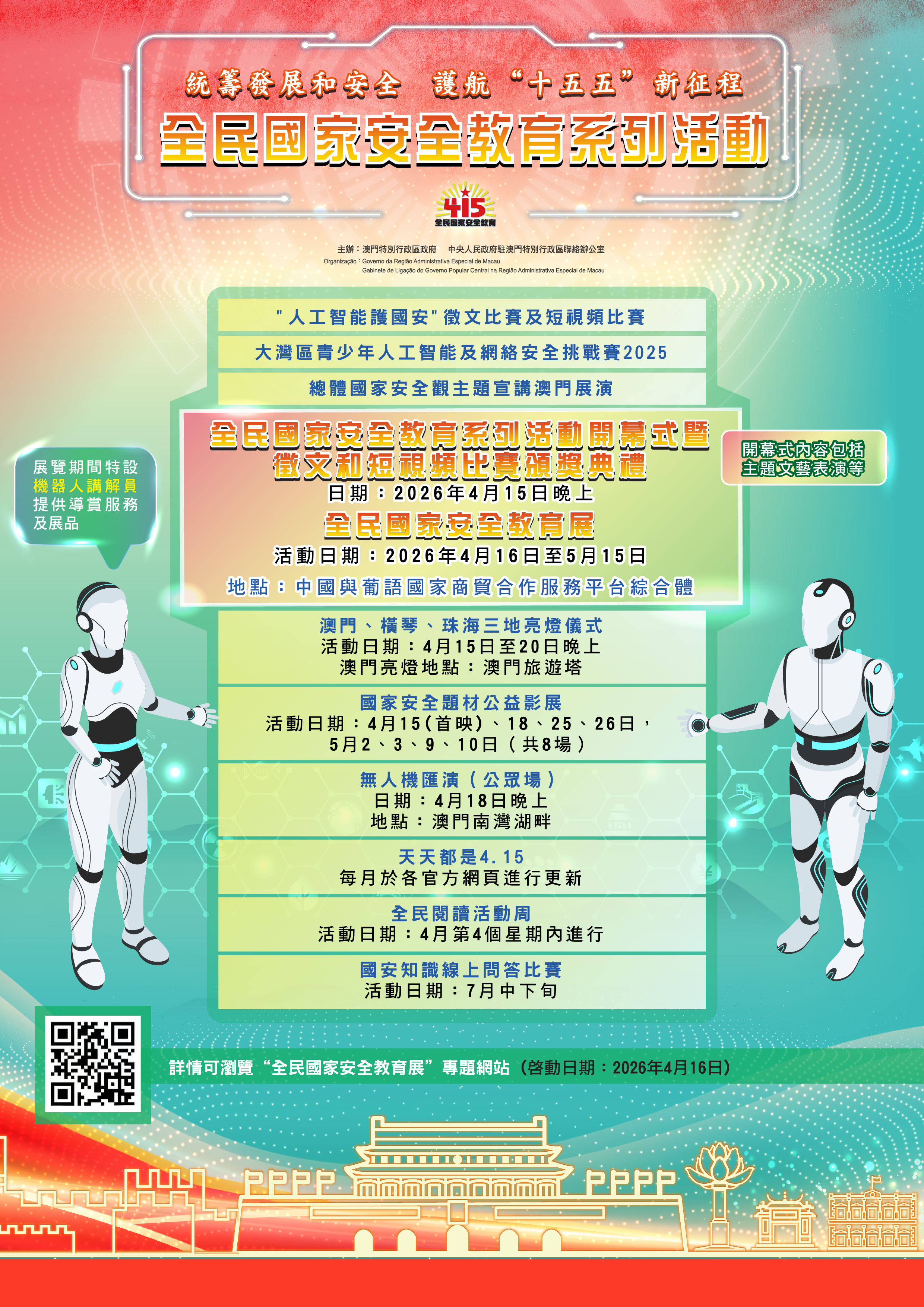 為貫徹落實總體國家安全觀,增強全民國家安全意識,澳門特別行政區政府與中央人民政府駐澳門特別行政區聯絡辦公室今年繼續合辦“全民國家安全教育系列活動”。本屆活動以“統籌發展和安全 護航‘十五五’新征程”為主題,透過多元化的宣傳教育與互動體驗,推動國家安全理念深入社會各階層。