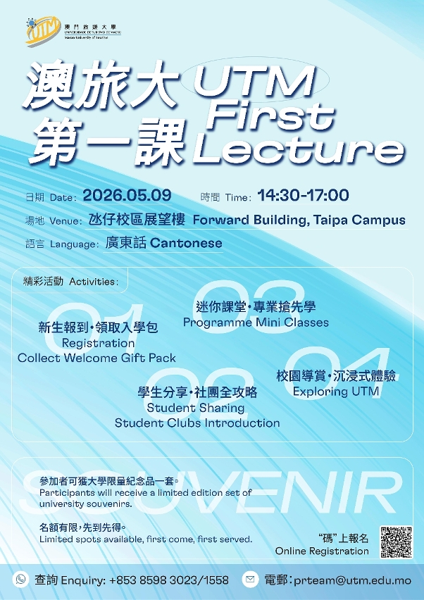 活動費用全免,名額有限,額滿即止。有意參加者需提前於網上報名,詳情請瀏覽網頁https://www.utm.edu.mo/s/FirstLecture2026或掃瞄海報上的二維碼。如有疑問,歡迎聯繫澳旅大公關範疇(電話:8598 3023 / 1558或電郵:pr@utm.edu.mo)。