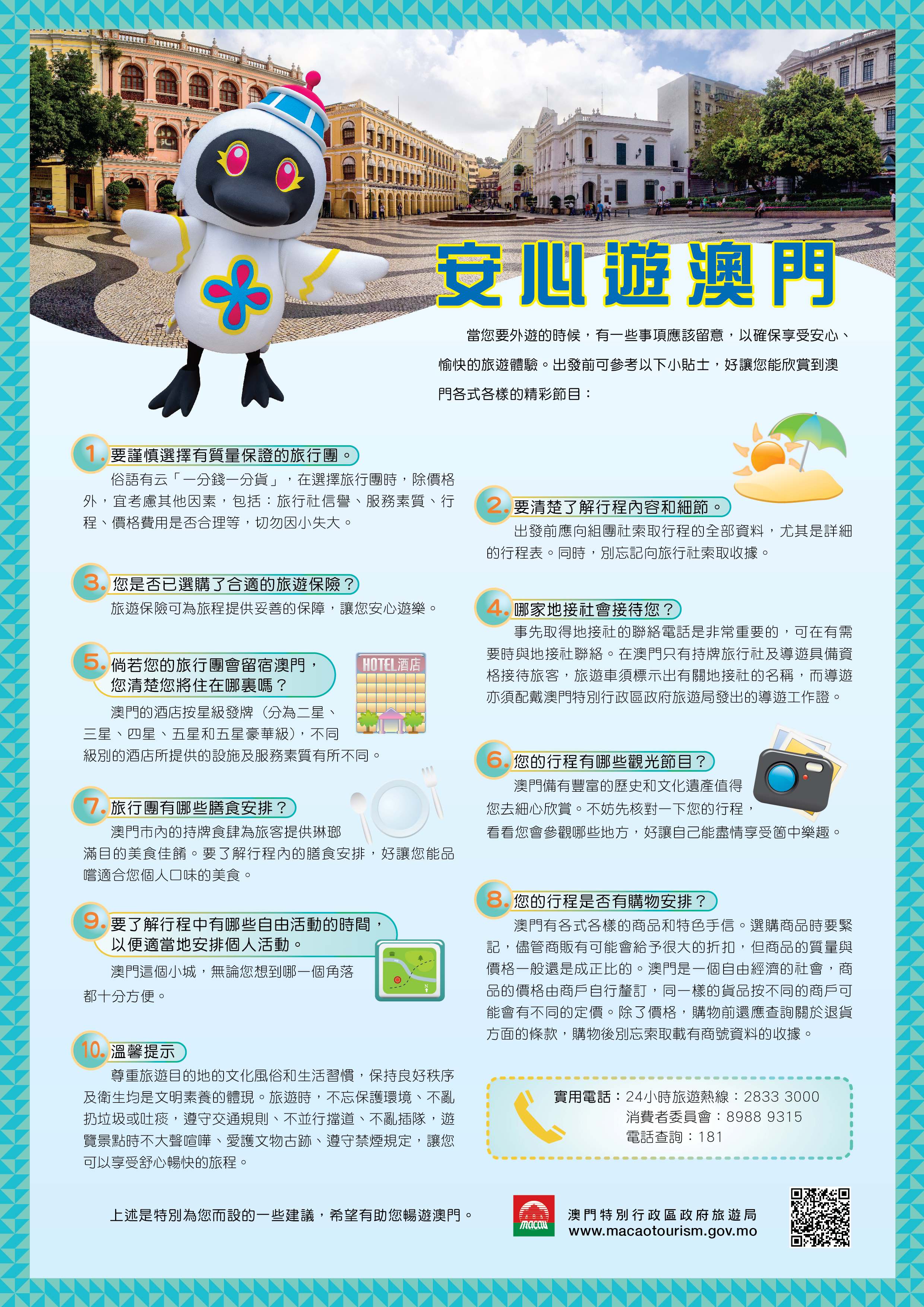 旅遊局製作之“安心遊澳門”圖文包及宣傳片於旅遊局網站播放。旅客可關注澳門特區政府旅遊局官方社交媒體帳號及透過澳門旅遊推廣網站(https://www.macaotourism.gov.mo)、“Experience Macao感受澳門”手機應用程式獲取澳門旅遊及相關資訊。